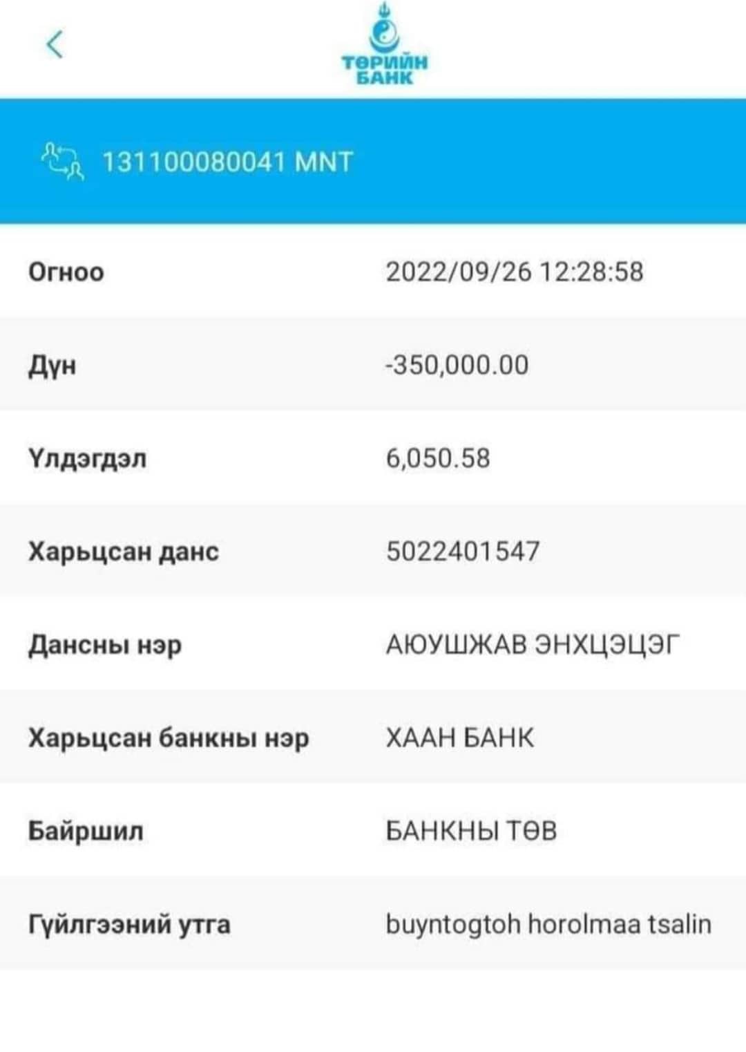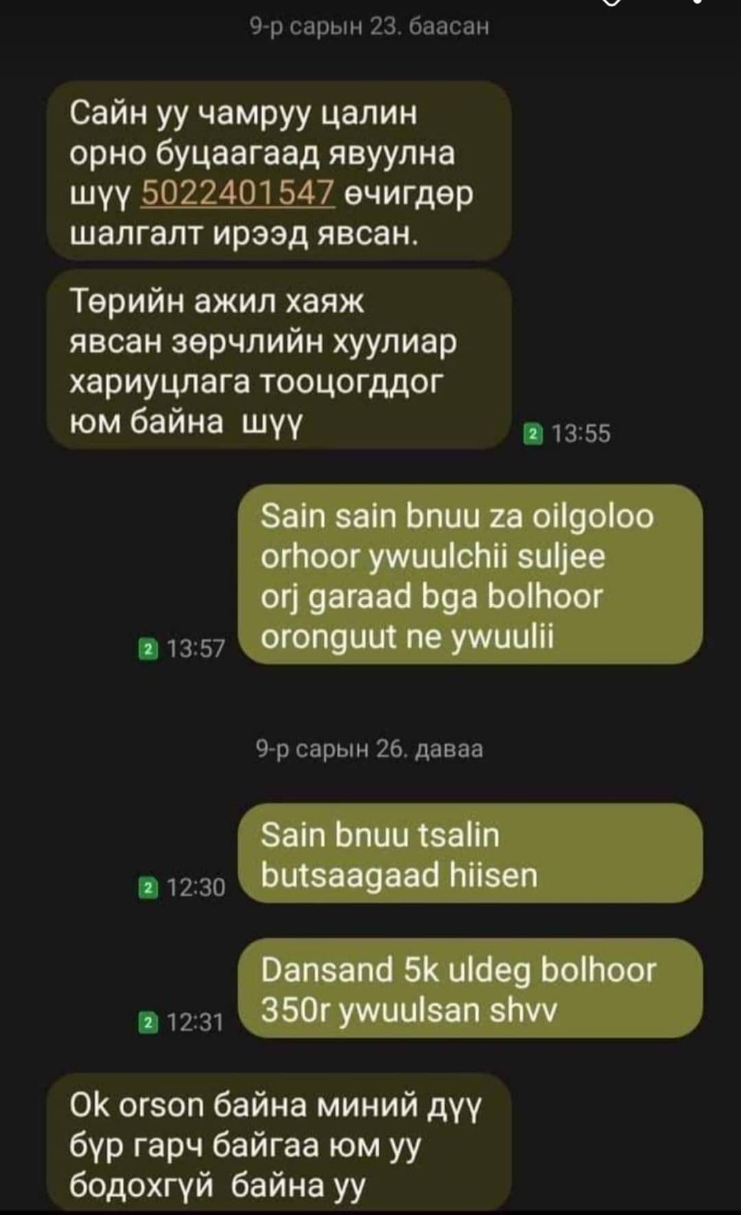 -Манай суманд ажилладаг н.Энхбуян гэх эмэгтэй хэсгийн ахлагчийг дарамталж байгаад дээрх мэдээллийг авсан байна лээ. Тухайлбал, манай хэсгийн ахлагч руу “Чи 700.000 төгрөгийн өрөнд орчихлоо. Даргынхаа данс руу мөнгө шилжүүлсэн бол тэр баримтаа над руу яаралтай явуул. Тэгэхгүй бол чамайг Баян-Өндөр сум шүүхэд өгнө шүү” гэж айлгасан байна лээ. Тэгээд чөлөө авсан хэсгийн ахлагч над руу шилжүүлсэн 350 мянган төгрөгийн баримтаа өгсөн юм билээ. Б.Хорлоогийн ар гэрийнхэн тус мэдээллийг айлган сүрдүүлж байгаад авсан болох нотлох баримтыг надад өгсөн. Хэсгийн ахлагч нар 350 мянган төгрөгийн цалин авдаг юм.