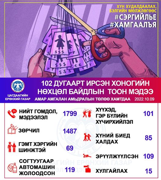 Мөн автомашин согтуугаар жолоодсон 119, хүний биед халдсан 85, хулгайн гэмт хэрэг 69, эрүүлжүүлэх байранд хоносон 109 тохиолдол бүртгэгджээ.