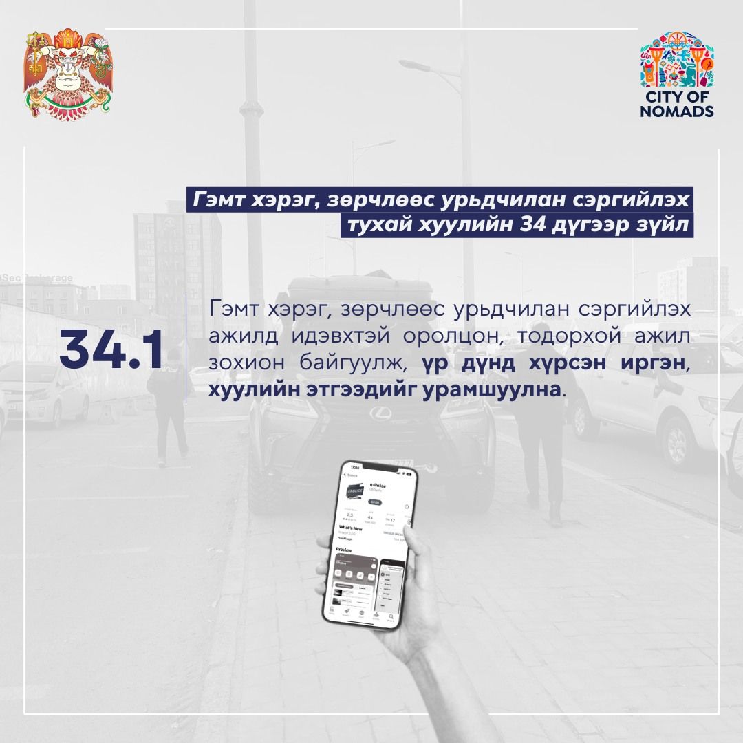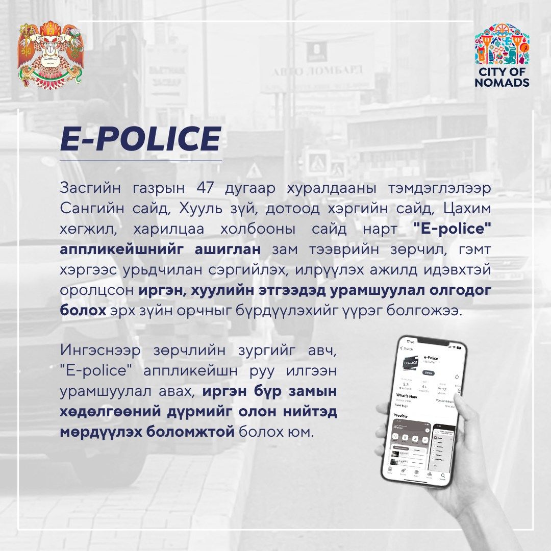 Тэгвэл Засгийн газрын 47 дугаар хуралдааны тэмдэглэлээр Сангийн сайд, Хууль зүй, дотоод хэргийн сайд, Цахим хөгжил, харилцаа холбооны сайд нарт "E-police" аппликэйшнийг ашиглан зам тээврийн зөрчил, гэмт хэргээс урьдчилан сэргийлэх, илрүүлэх ажилд идэвхтэй оролцсон иргэн, хуулийн этгээдэд урамшуулал олгодог болох эрх зүйн орчныг бүрдүүлэхийг үүрэг болгожээ.