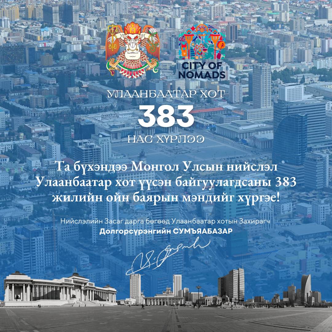 Нийслэл Улаанбаатар хот үүсэн байгуулагдсаны 383 жилийн ойн баярын мэндийг хүргэе.