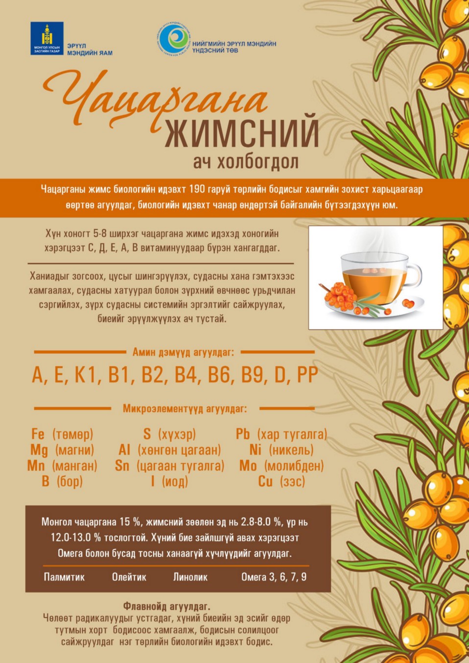 2. Монгол чацаргана 15 хувь, жимсний зөөлөн эд нь 2.8-8.0 хувь, үр нь 12.0-13.0 хувийн тослогтой. Хүний бие зайлшгүй авах хэрэгцээт Омега болон бусад тосны ханаагүй хүчлүүдийг (Палмитик, Олейтик, Линолик, Омега 3, 6, 7, 9) агуулдаг.