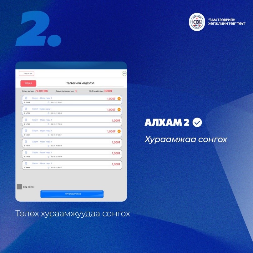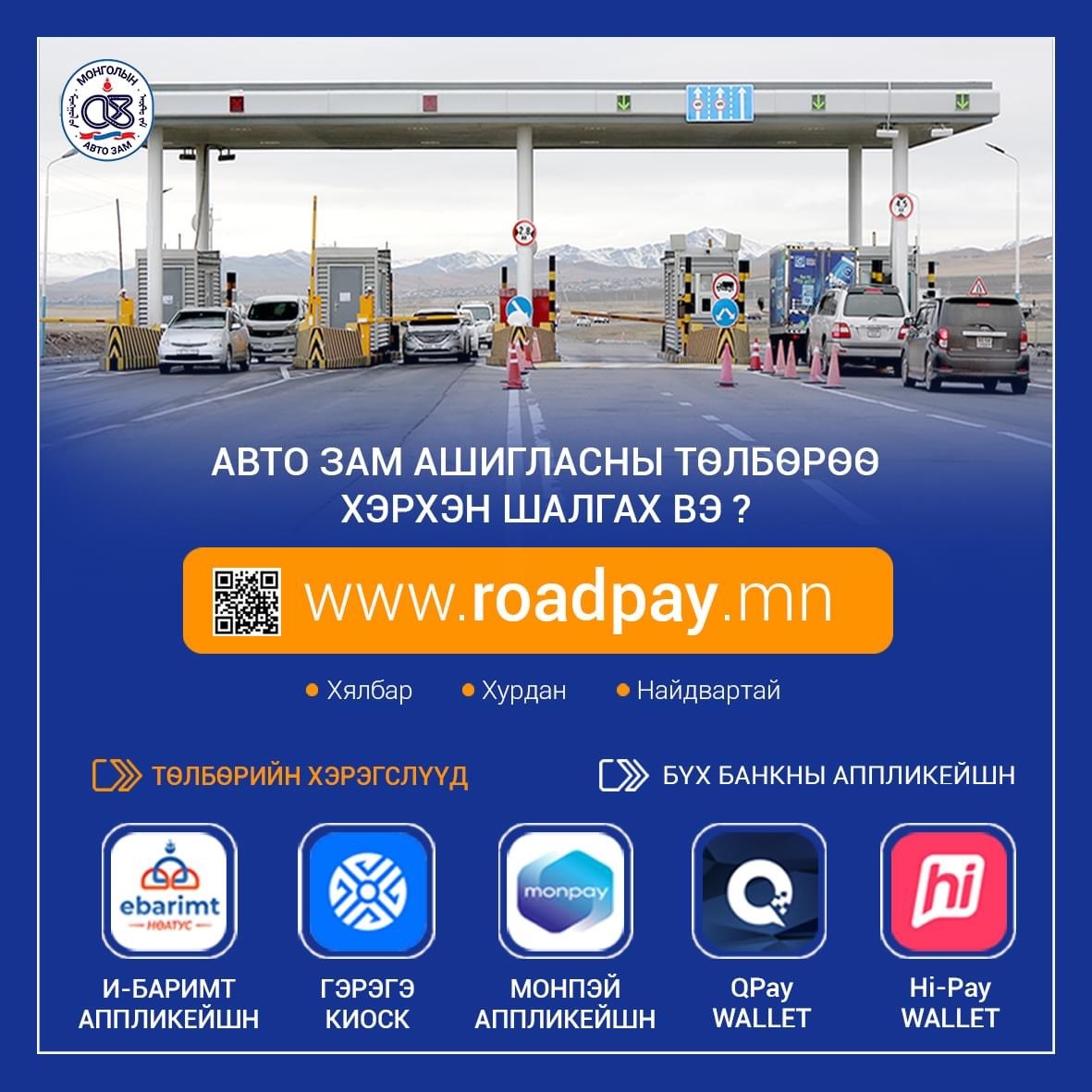 Улаанбаатар орчмын Эмээлт, Налайх-Тэрэлж, Хоолт, Түргэний гүүр, Хөшигийн хөндий төлбөр авах цэгүүд бүрэн цахимжсан.Цахим төлбөр авах цэгээр нэвтэрснээр , Бэлэн мөнгө төлөх шаардлагагүй, дараалал түгжрэл үүсгэхгүй www.roadpay.mn сайтад тээврийн хэрэгслийн дугаараа оруулж автозам ашигласны төлбөрөө шалгаж баталгаажуулан хялбар хурдан төлөөрэй.
