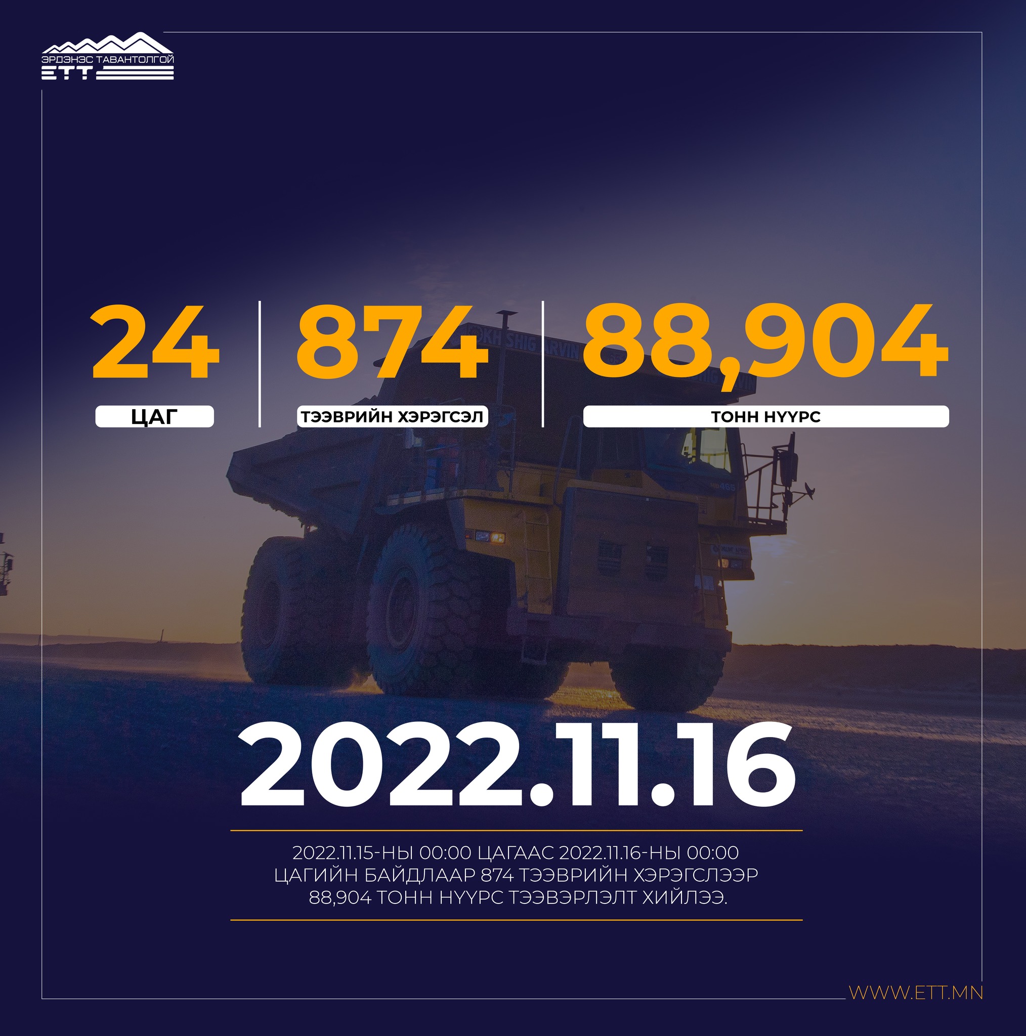 "Эрдэнэс Тавантолгой" ХК-наас 2022 оны арваннэгдүгээр сарын 16-ны өдөр Тавантолгой - Цагаанхад чиглэлд 874 тээврийн хэрэгслээр 88.904 тонн нүүрс тээвэрлэжээ.