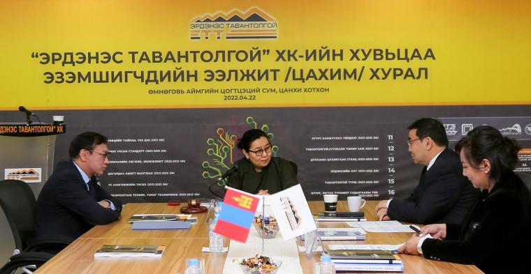 “Эрдэнэс Тавантолгой” ХК-ийн Хувьцаа эзэмшигчдийн ээлжит хурал 2022 оны 4 дүгээр сарын 22-ны өдрийн 08:00-10.00 хооронд Өмнөговь аймаг, Цогтцэций сум дахь уурхай салбар, Цанхи хотхонд боллоо. Засгийн газрын холбогдох шийдвэр, Санхүүгийн зохицуулах хорооны журам, зөвлөмжид заасны дагуу ”Эрдэнэс Тавантолгой” ХК-ийн Хувьцаа эзэмшигчдийн ээлжит хурлыг мэдээллийн технологийн шийдэл ашиглан зайнаас цахим хэлбэрээр зохион байгуулж, хувьцаа эзэмшигч иргэдэд компанийн www.ett.mn хаяг “Live” цонх, www.facebook.com -ийн “1072 Хувьцаа Мэдэээллийн төв” хуудсаар шууд дамжуулан, санал хүсэлтийг 1800-1072 утсаар болон компанийн албан ёсны сошиал хаягаар авч, ил тод нээлттэй явуулсан. Хуралд тус компанийн төрийн эзэмшлийн хувьцааг эзэмшигчийн эрхийг хэрэгжүүлэгч, саналын эрх бүхий төлөөлөгч болон компанийн удирдлагууд оролцлоо. Хувьцаа эзэмшигчдийн ээлжит хурлаар “Эрдэнэс Тавантолгой” ХК-ийн 2021 оны үйл ажиллагааны болон санхүүгийн тайлангийн талаарх Төлөөлөн удирдах зөвлөлийн дүгнэлтийг батлах, Ногдол ашиг хуваарилахгүй тухай шийдвэрийг танилцуулах, Компанийн дүрэмд оруулах өөрчлөлт, Төлөөлөн удирдах зөвлөлийн гишүүдийг сонгох болон Компанийн “А6-20” 2021-2025 онд хэрэгжүүлэх дунд хугацааны бизнес төлөвлөгөө, урт хугацааны стратеги төлөвлөгөөг танилцуулах асуудлуудыг тус тус хэлэлцсэн байна. Дэлхий нийтээр тархсан Ковид-19 цар тахлын дэгдэлтээс үүдэлтэй хилийн хорио тогтоосноор “Эрдэнэс Тавантолгой” ХК-ийн нүүрсний экспорт огцом буурсан боловч эрдлийн үеийн төлөвлөгөөг хэрэгжүүлсэнээр 2021 онд 1.1 их наяд төгрөгийн борлуулалтын орлоготой ажиллаж, улсын төсөвт 420.6 тэрбум төгрөгийн татвар хураамжийг төвлөрүүлж, 110.7 тэрбум төгрөгийн цэвэр ашигтай ажилласан байна. Тайлант хугацаанд Тавантолгой-Зүүнбаян, Тавантолгой-Гашуун сухайт чиглэлийн төмөр замын бүтээн байгуулалтын төслүүд, Улаанбаатар хотын агаарын бохирдлыг бууруулах зорилгоор “Тавантолгой түлш” ХХК-д шаардлагатай санхүүжилт болон холбогдох бусад томоохон төсөл, хөтөлбөрүүдийн санхүүжилтийг төр, засгийн шийдвэрийн дагуу үе шаттайгаар шийдвэрлэж ажиллажээ. Цаашид компанийг хөгжүүлэх “А6-20” 2021-2025 оны бизнес төлөвлөгөөг хэрэгжүүлэх, нэмүү өртөг шингэсэн бүтээгдэхүүн үйлдвэрлэх, олон улсын нүүрсний зах зээлд өрсөлдөх чадварыг сайжруулахад чиглэсэн дэд бүтэц, бүтээн байгуулалтын төслүүдийг эрчимжүүлж, Монгол Улсын Их Хурлаас баталсан Шинэ сэргэлтийн бодлого, Монгол Улсын Засгийн газраас баталсан “Эрүүл мэндээ хамгаалж, эдийн засгаа сэргээх 10.0 (арван) их наядын цогц төлөвлөгөө”-г хэрэгжүүлж, хөрөнгө оруулалтын үр өгөөжийг нэмэгдүүлэхээр ажиллаж байна.
