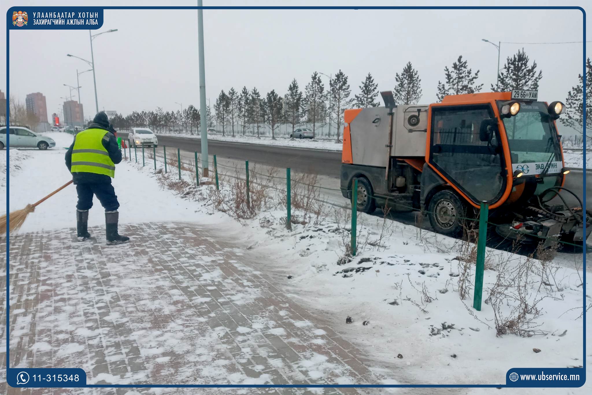 Зам талбайн цэвэрлэгээний 18 байгууллагын 72 машин техник, 878 зам талбайн үйлчлэгч 13.2 сая мкв талбайн цэвэрлэгээг хийж гүйцэтгэв. Нийслэлийн алслагдсан зам болох Морингийн даваа, Айцын даваа, Ар гүнт, Өвөр гүнт зэрэг замуудад одоогийн байдлаар халтиргаа гулгаа үүсээгүй хөдөлгөөн хэвийн байна.