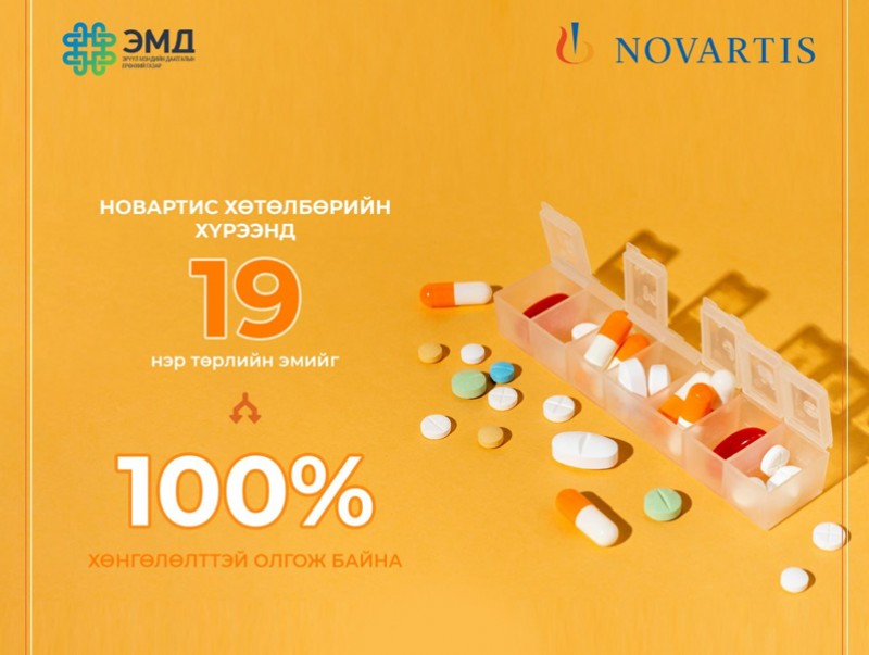 ЭМДЕГ , Швейцарийн Новартис компанитай хамтран олон улсад хүлээн зөвшөөрөгдсөн зүрх судас, чихрийн шижин, уушгины эмгэг болон хавдрын үед хэрэглэх 19 төрлийн эмийг ЭМД-ын шимтгэлээ төлсөн хүн бүрд ЭМД-ын сангаас 100 хувь хөнгөлөлттэй үнээр олгож байна.
