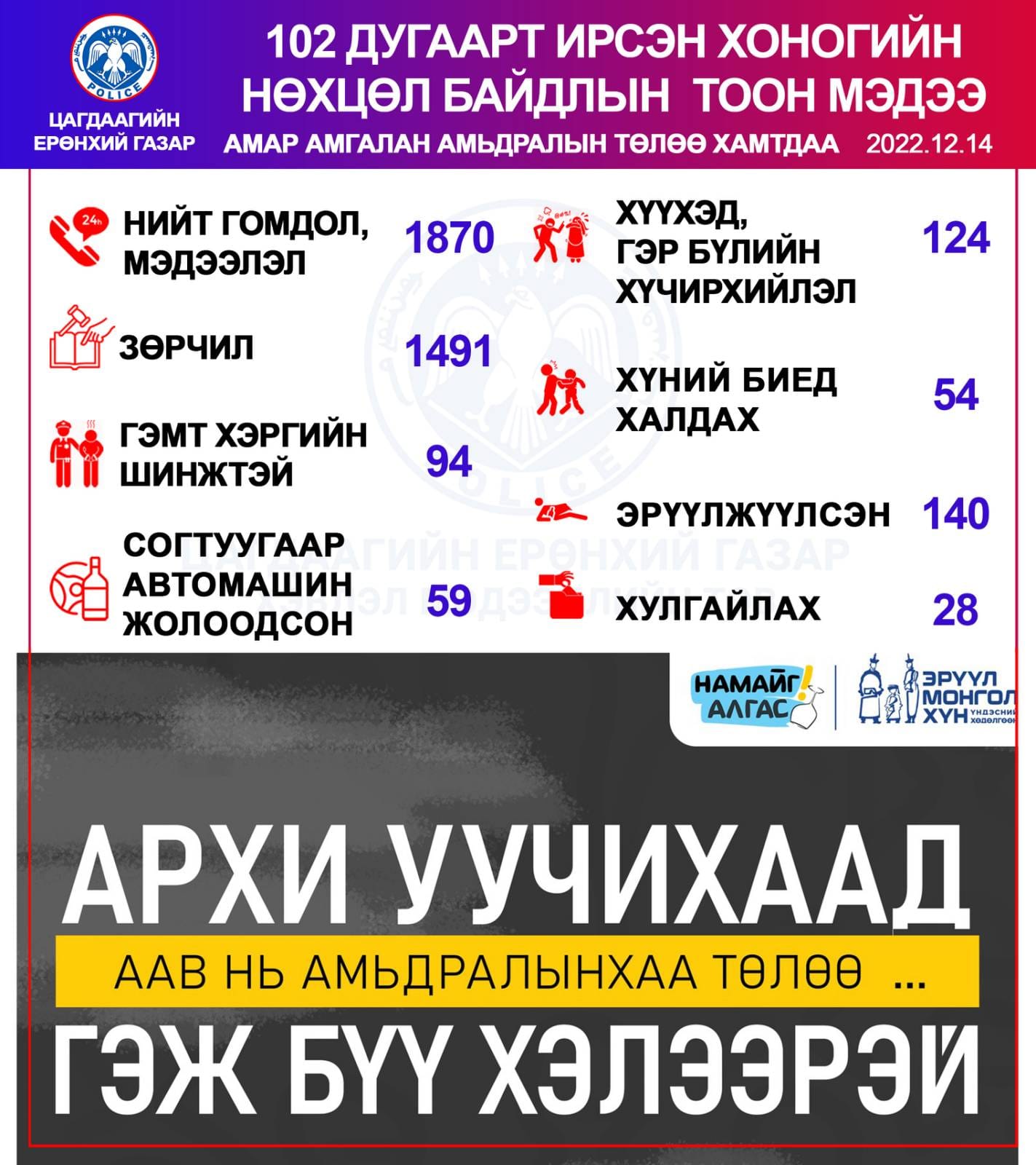Мөн автомашин согтуу жолоодсон 59, хүний биед халдсан 54, эрүүлжүүлэх байранд хоносон 140 тохиолдол гарчээ.