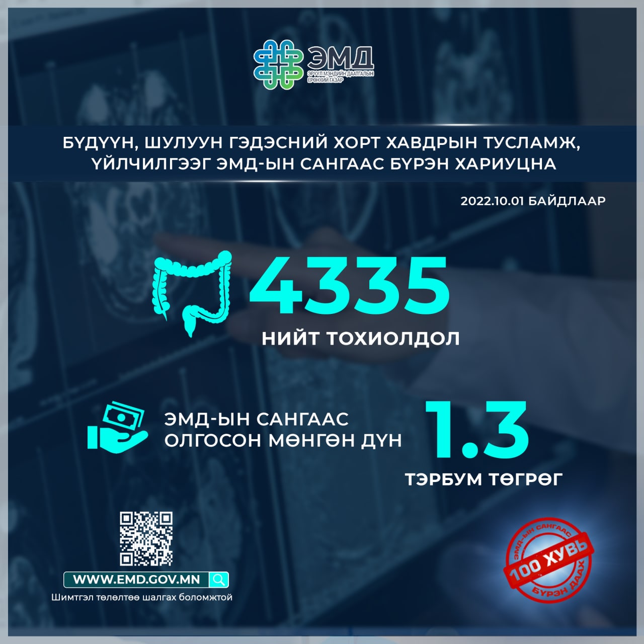 2022 оны эхний арван сарын байдлаар энэхүү тусламж, үйлчилгээний 4335 тохиолдол бүртгэгдэж, ЭМД-ын сангаас 1.3 тэрбум төгрөгийн санхүүжилт олгосон байна.