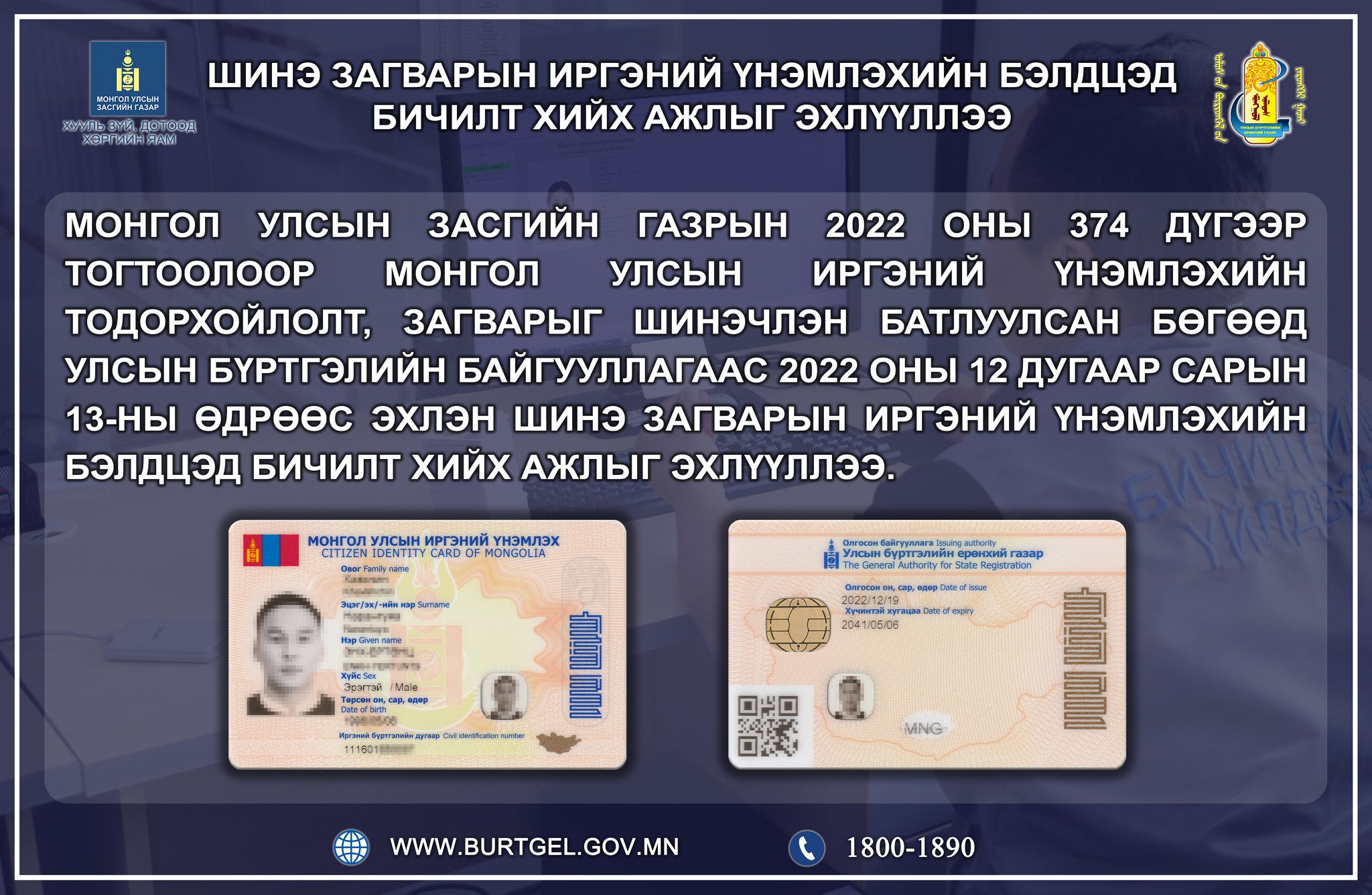 Мөн Монгол Улсын Засгийн газрын 2022 оны 374 дүгээр тогтоолоор Монгол Улсын иргэний үнэмлэхийн тодорхойлолт, загварыг шинэчлэн батлуулсан бөгөөд Улсын бүртгэлийн байгууллагаас 2022 оны арванхоёрдугаар сарын 13-ны өдрөөс эхлэн шинэ загварын иргэний үнэмлэхийн бэлдцэд бичилт хийх ажлыг эхлүүллээ