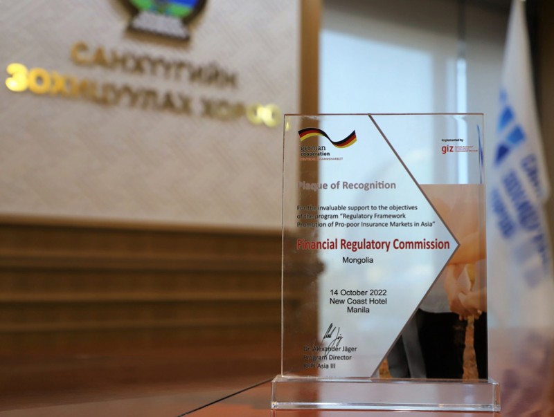 ХБНГУ-ын Олон улсын хамтын ажиллагааны нийгэмлэг (GIZ)-ээс “Азийн орнуудад хүртээмжтэй даатгалын зах зээлийг хөгжүүлэхэд зохицуулалтын байгууллагын оролцоо” хөтөлбөрийг хэрэгжүүлэхэд үнэтэй хувь нэмэр оруулсан хэмээн Санхүүгийн зохицуулах хороонд талархлын цом гардууллаа.