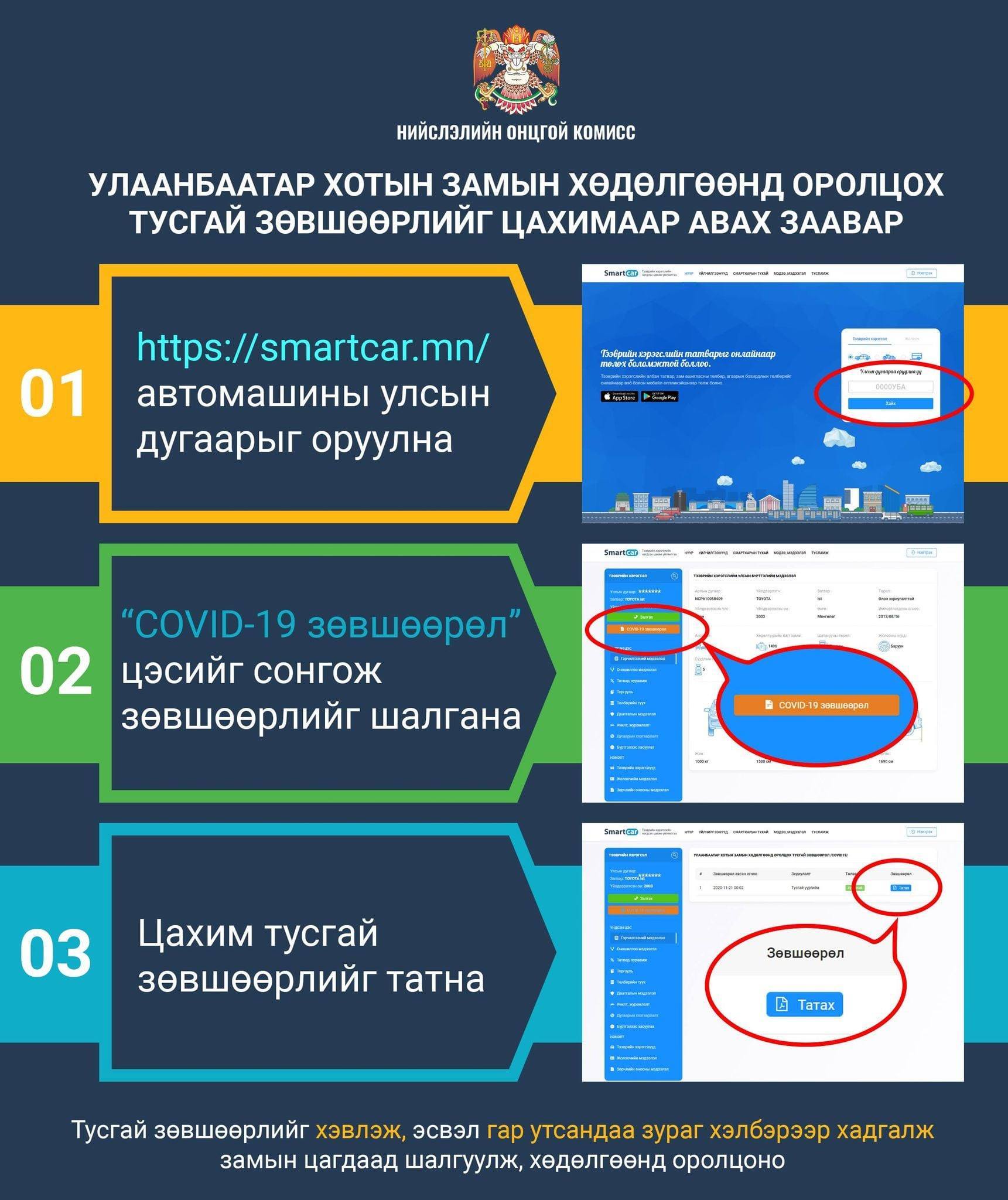 Уг шийдвэрт дахин өөрчлөлт оруулж өнгөрөгч бямба гарагаас автомашинууд QR код уншуулж хөдөлгөөнд оролцох болсон талаар Захирагчийн ажлын албаны дарга Т.Гантөмөр хэлэхдээ "QR код даваа гарагт бэлэн болно. Код дээр байгууллагын дугаар, автомашины марк, сери бий. Энэ ажлыг Замын инженерчлэлийн газар хариуцан ажиллаж байгаа" гэсэн юм. Улаанбаатар хотын замын хөдөлгөөнд оролцох автомашины QR зөвшөөрлийг цахимаар олгохоор болсон байна. Тиймээс доорх заавраар зөвшөөрлийг авах юм байна.