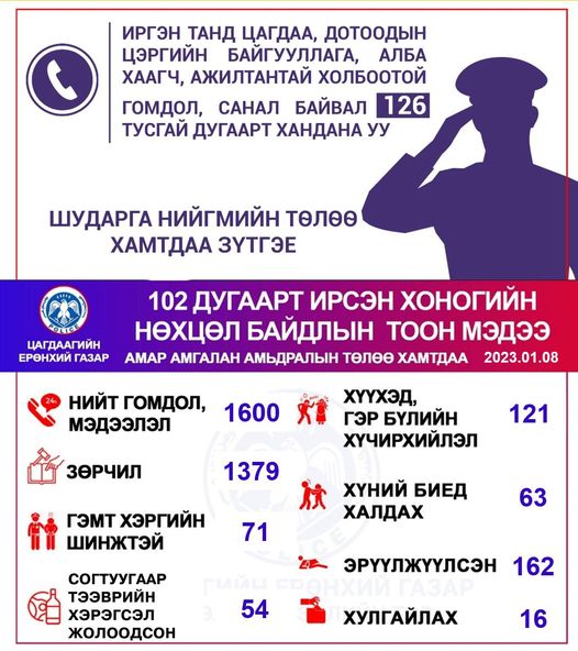 Үүнээс зөрчлийн дуудлага мэдээлэл 1379, хулгайтай холбоотой 16, хүүхэд, гэр бүлийн хүчирхийллийн дуудлага 121, гэмт хэргийн шинжтэй 71 мэдээлэл бүртгэгдсэн байна. Мөн автомашин согтуу жолоодсон 54, хүний биед халдсан 63, эрүүлжүүлэх байранд хоносон 162 тохиолдол гарчээ.
