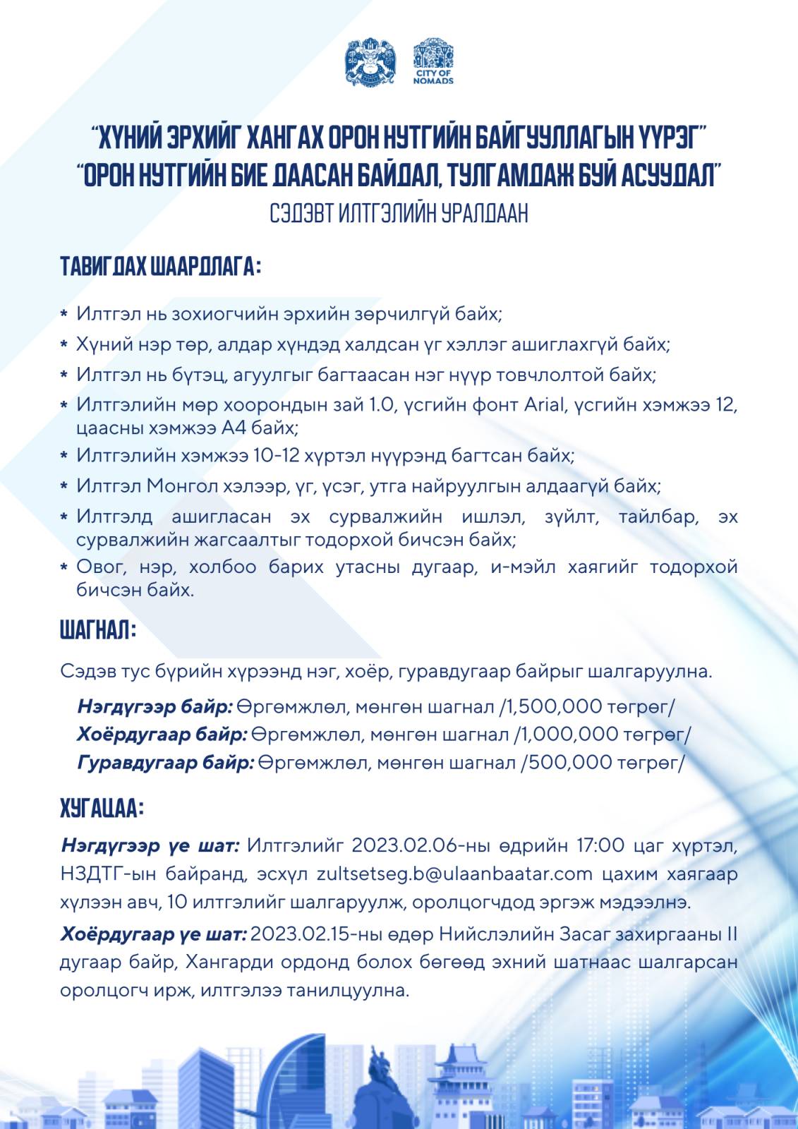 Сэдэв тус бүрийн хүрээнд байр шалгаруулах бөгөөд нэгдүгээр байр 1,500,000, хоёрдугаар байр 1,000,000, гуравдугаар байр 500,000 төгрөгийн шагналын сантай. Илтгэлийг 2023 оны хоёрдугаар сарын 6-ны 17:00 цаг хүртэл НЗДТГ-ын байранд, эсхүл [email protected] цахим хаягаар хүлээн авна.