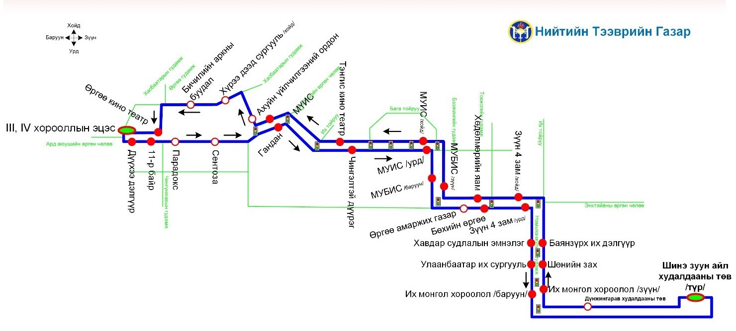 Иймд иргэд та бүхэн тухайн чиглэлд үйлчлүүлэх бол доорх зураглалын дагуу зорчих хэсгээ төлөвлөхийг Нийтийн тээврийн газраас анхааруулжээ. Чиглэлийн үйлчилгээтэй холбоотой санал хүсэлтийг 70044040 дугаарын утсанд 24 цагийн турш хүлээн авч шуурхай шийдвэрлэх аж.