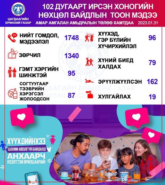 Автомашин согтуу жолоодсон 87, хүний биед халдсан 79 , эрүүлжүүлэх байранд хоносон 162 тохиолдол гарчээ.