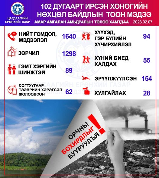 Мөн автомашин согтуу жолоодсон 62, хүний биед халдсан 55, эрүүлжүүлэх байранд хоносон 154 тохиолдол гарчээ.
