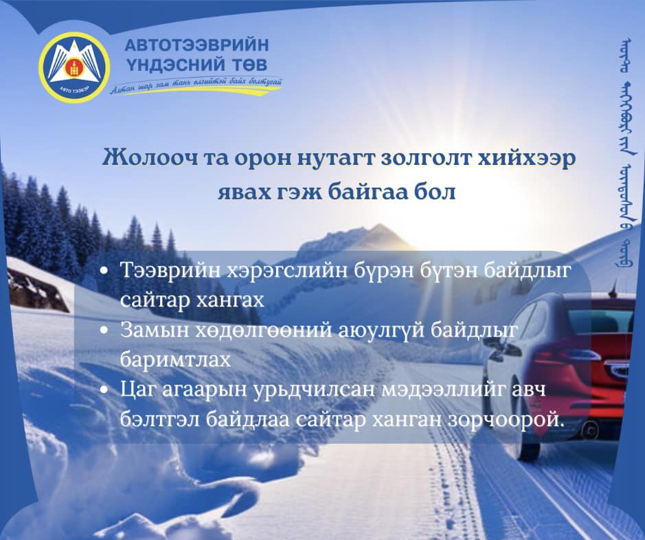 Автотээврийн үндэсний төвөөс орон нутагт золголт хийхээр явах гэж байгаа бол тээврийн хэрэгслийн бүрэн бүтэн байдлыг сайтар хангаж замын хөдөлгөөний аюулгүй байдлыг баримтлан, цаг агаарын урьдчилсан мэдээллийг авч бэлтгэл байдлаа сайтар ханган зорчихыг анхаарууллаа.