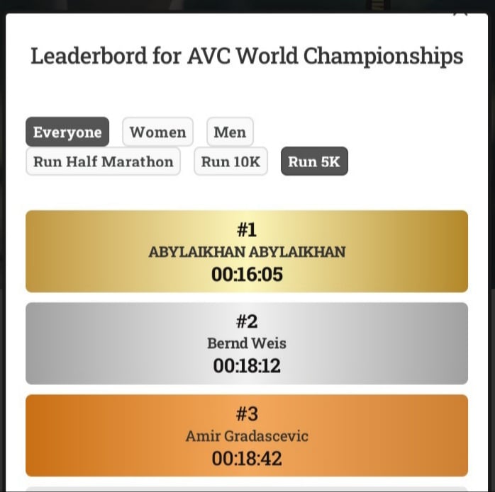 Монгол Улсын тамирчин Б.Абылайхан саяхан AVC-ээс зохион байгуулсан дэлхийн аварга шалгаруулах тэмцээнд тэргүүн байр эзэлжээ. Энэ удаагийн тэмцээнийг АНУ-аас зохион байгуулсан бөгөөд тэмцээнд 50 орны 64 тамирчин оролцжээ. Коронавирус цар тахлын улмаас тухайн тэмцээн онлайнаар явагджээ. Ингэхдээ тусгай Страва програмаар тэмцээнийг хянасан аж. Өөрөөр хэлбэл оролцогч бүр GPS-ашиглаад гүйсэн байна. Б.Абылайхан таван км замыг 16 минут 5 секундад туулж, түрүүлжээ.
