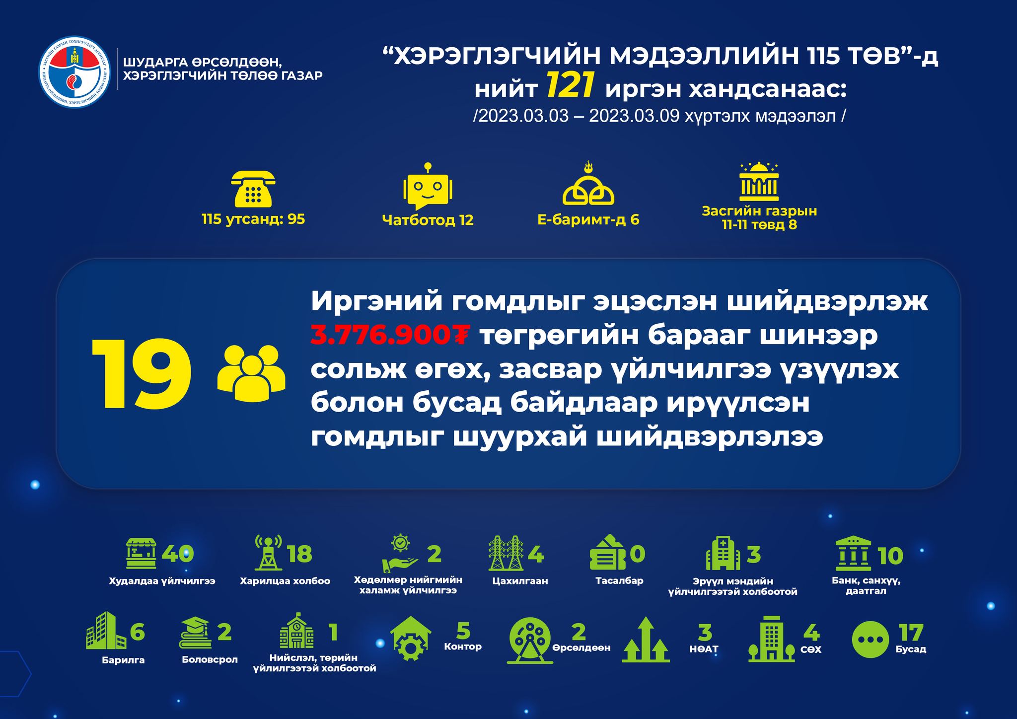 “Хэрэглэгчийн мэдээллийн 115 төв”-д нийт 121 иргэн хандсанаас 115 утсанд 95, чатботод 12, и баримт апликейшн зургаа, Засгийн газрын иргэд олон нийттэй харилцах “11-11” төвөөс найман гомдол мэдээлэл ирсэн бөгөөд 77 иргэнд зөвлөгөө мэдээлэл өгч, 12 иргэний гомдлыг санал, хүсэлтээр хүлээн авч, 12 иргэний гомдол, мэдээлэл судлагдаж хариу өгөхөөр хүлээгдэж, 19 иргэний гомдлыг эцэслэн шийдвэрлэсэн байна.