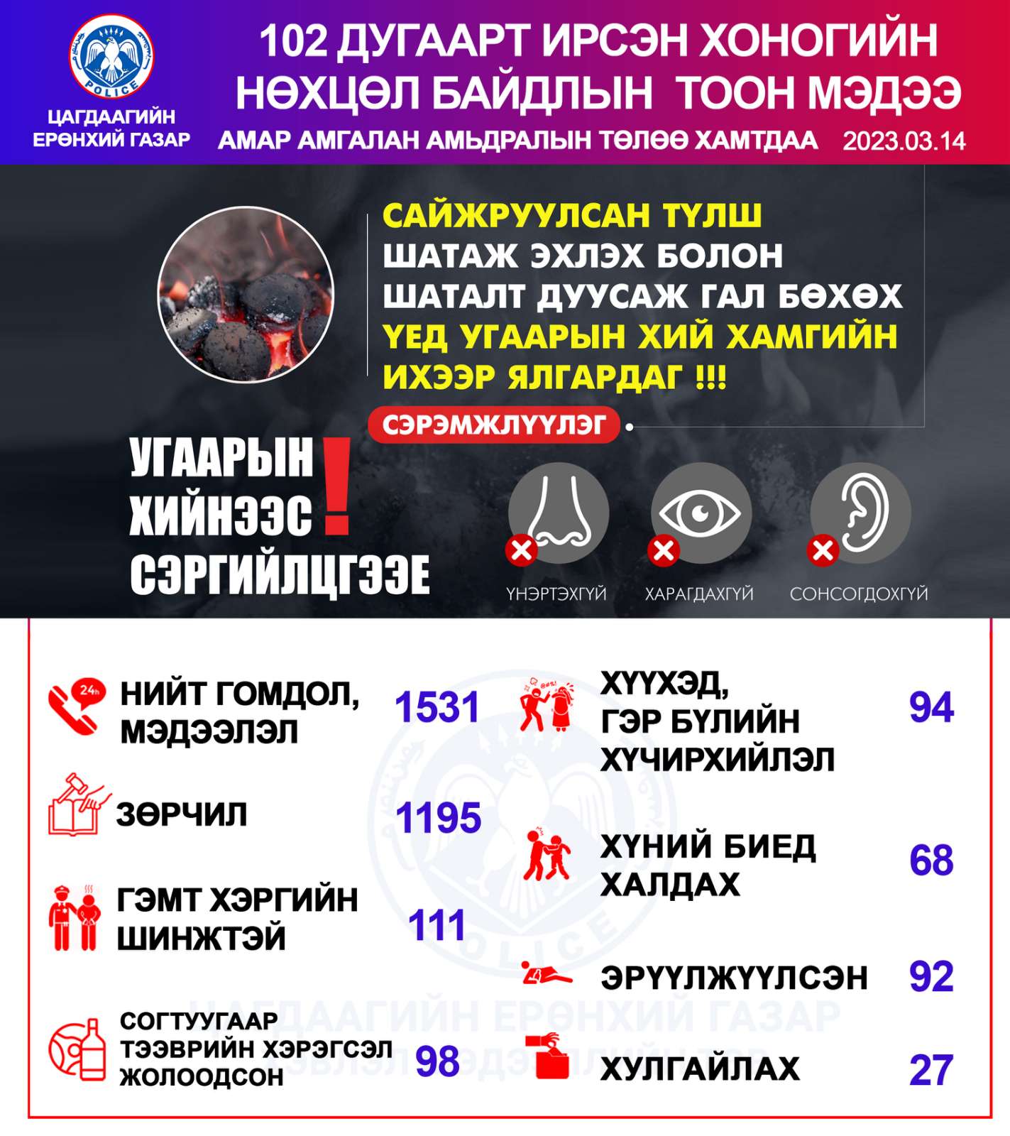 Үүнээс гадна автомашин согтуу жолоодсон 98, хүний биед халдсан 68, эрүүлжүүлэх байранд хоносон 92 тохиолдол гарчээ.