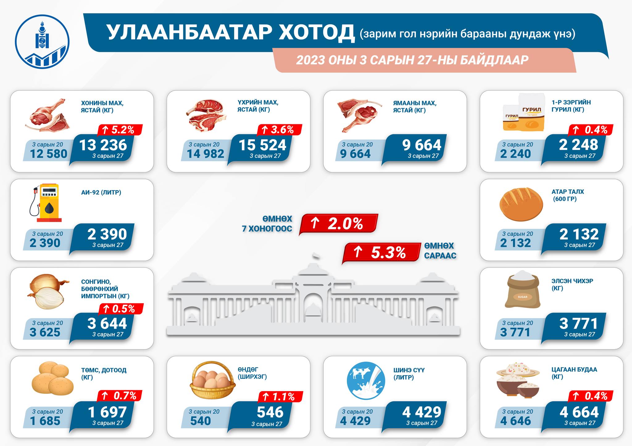 | Өргөн хэрэглээний барааны үнэ өмнөх долоо хоногоос хоёр хувиар өсжээ |