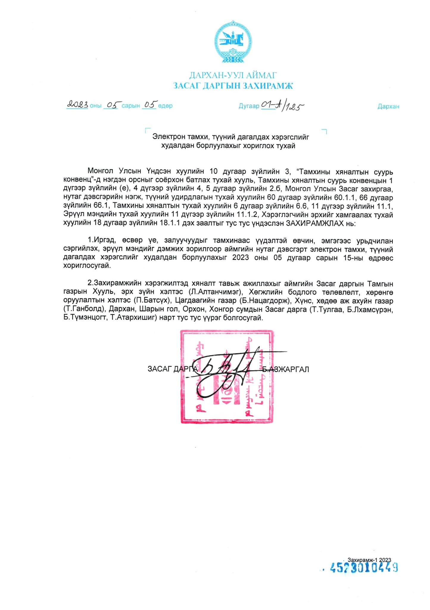 Иргэдийн болон өсвөр үеийнхний эрүүл мэндийг хамгаалах, хорт зуршлаас урьдчилан сэргийлэх зорилгоор Дархан-Уул аймгийн хэмжээнд электрон тамхи, түүний дагалдах хэрэгслийг 2023.05.15-ны өдрөөс эхлэн худалдан борлуулахыг хориглоно гэж Дархан-Уул аймгийн Засаг дарга Б.Азжаргал мэдээлэв.
