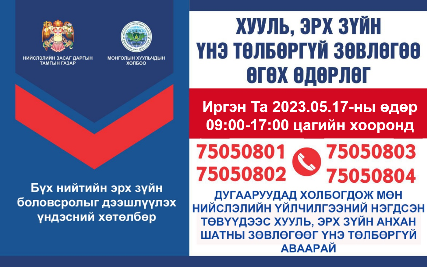 | Хууль, эрх зүйн зөвлөгөөг үнэ төлбөргүй өгч байна |