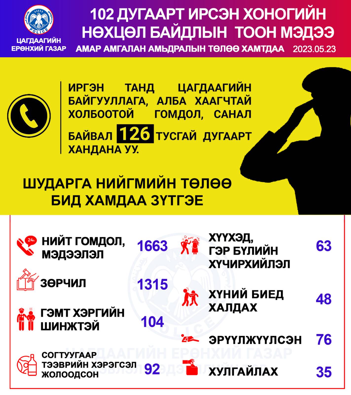 Үүнээс гадна автомашин согтуу жолоодсон 92 , хүний биед халдсан 48, эрүүлжүүлэх байранд хоносон 76 тохиолдол гарчээ.