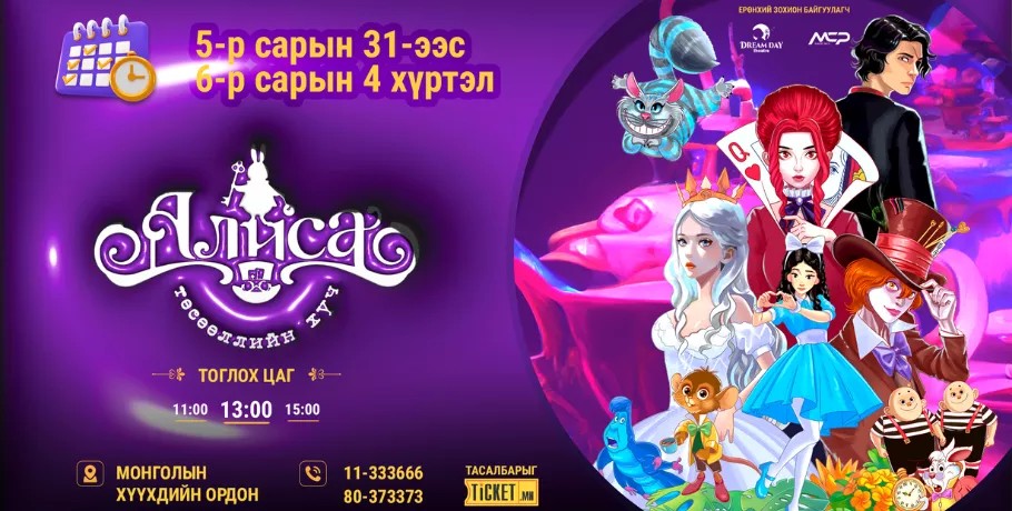 Dream Day театрын хамт олон хүүхэд багачууддаа зориулж Английн зохиолч Льюис Кэрроллын “Алиса гайхамшгийн оронд” бүтээлээс сэдэвлэн цоо шинэ, адал явдалт “АЛИСА” хүүхдийн жүжгийг Монголын Хүүхдийн Ордны Их Танхимд тоглох гэж байна.