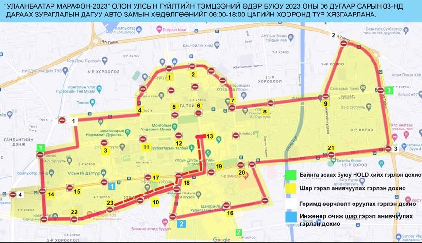 Автомашингүй өдөр маргааш тохиож байна. Энэ өдөр "Улаанбаатар Марафон-2023" олон улсын гүйлтийн тэмцээн болох билээ. Энэ үеэр хэд хэдэн байршилд замын хөдөлгөөн хаах юм. Тодруулбал, баруун дөрвөн замаас зүүн дөрвөн замын уулзвар хүртэл 06.00-18.00 цагийн хооронд автомашин зорчихгүй юм.