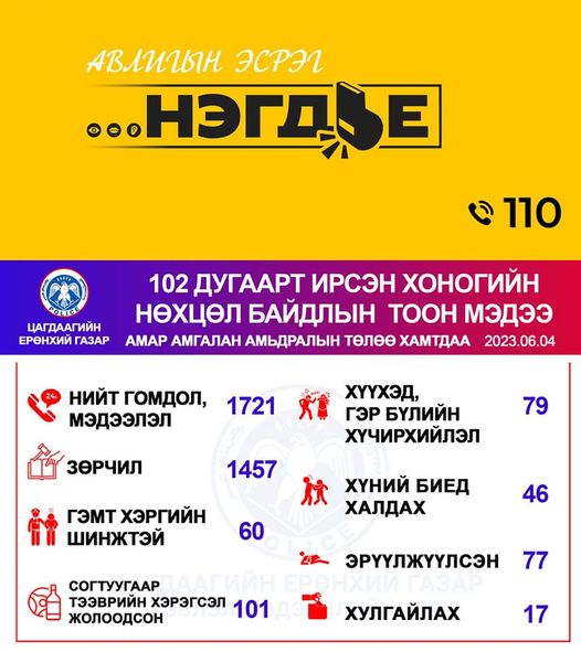 Үүнээс гадна автомашин согтуугаар жолоодсон 101, хүний биед халдсан 46, эрүүлжүүлэх байранд хоносон 77 тохиолдол гарчээ.