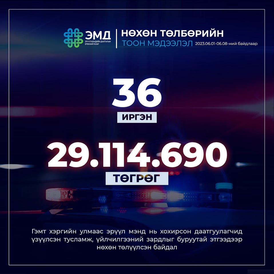 Тэгвэл 2023 оны зургаадугаар сарын 1-8-ны байдлаар 36 даатгуулагч-иргэнд ЭМД-ын сангаас 29 сая 114 мянган төгрөг зарцуулсныг хуулийн хүрээнд буруутай этгээдээр нөхөн төлүүлж, ЭМД-ын санг хохиролгүй болголоо.