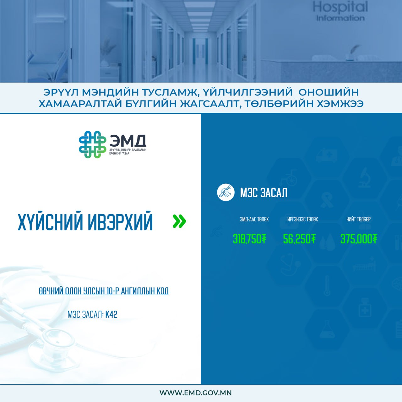 Хүйсний ивэрхийн мэс заслын 85 хувийг ЭМД-ын сангаас хөнгөлнө. ЭМДҮЗ-ийн 2022 оны нэгдүгээр тогтоолоор хүйсний ивэрхийн мэс заслыг 375 мянган төгрөг байхаар зохицуулсан бөгөөд үүний 15 хувийг иргэн өөрөө хариуцан төлнө.