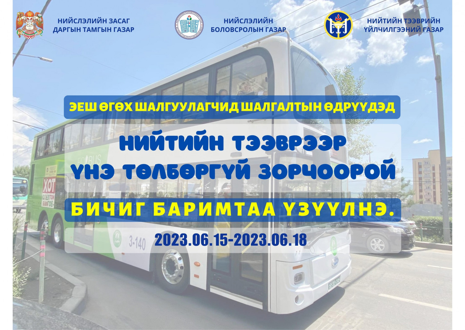 | Элсэлтийн ерөнхий шалгалт өгөх сурагчид нийтийн тээврээр үнэгүй зорчих эрхтэй болжээ |