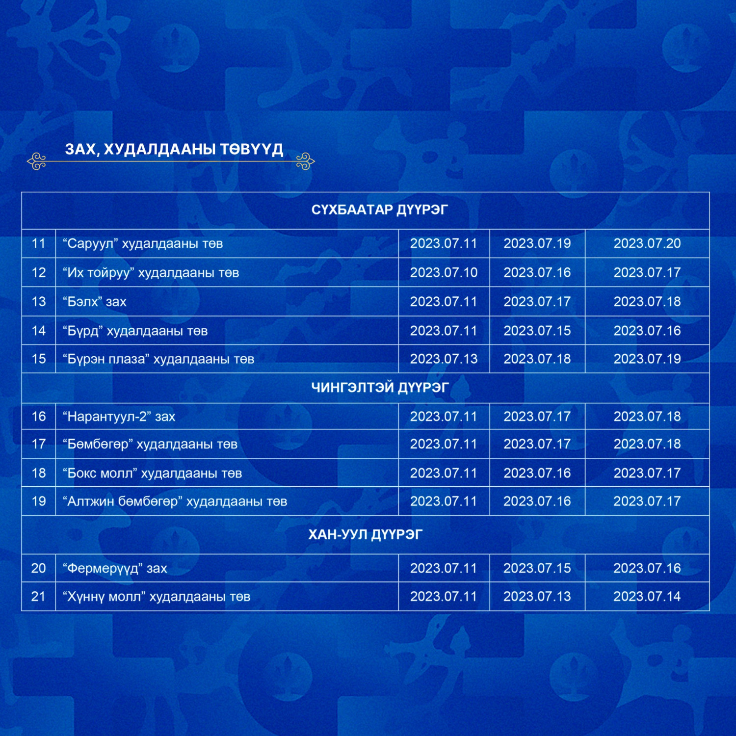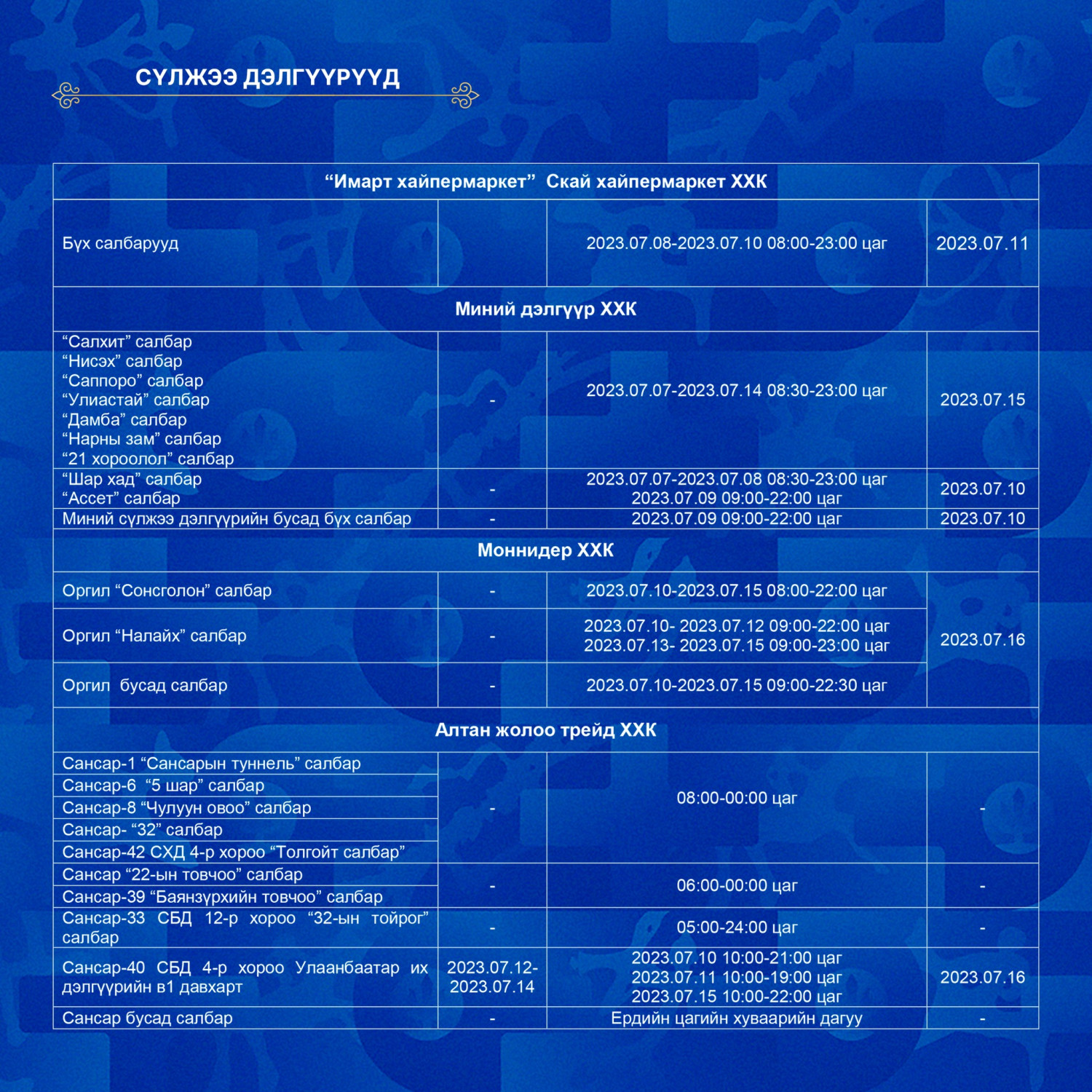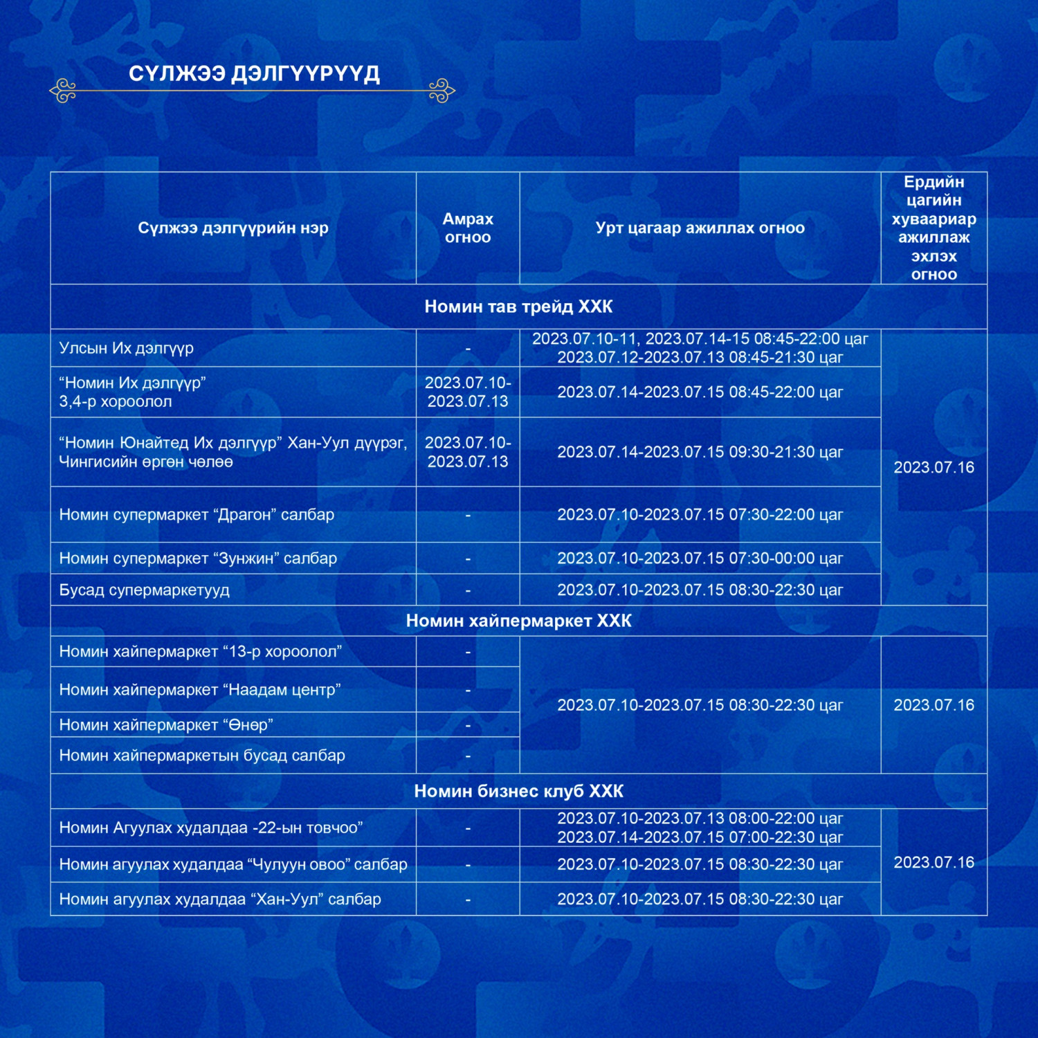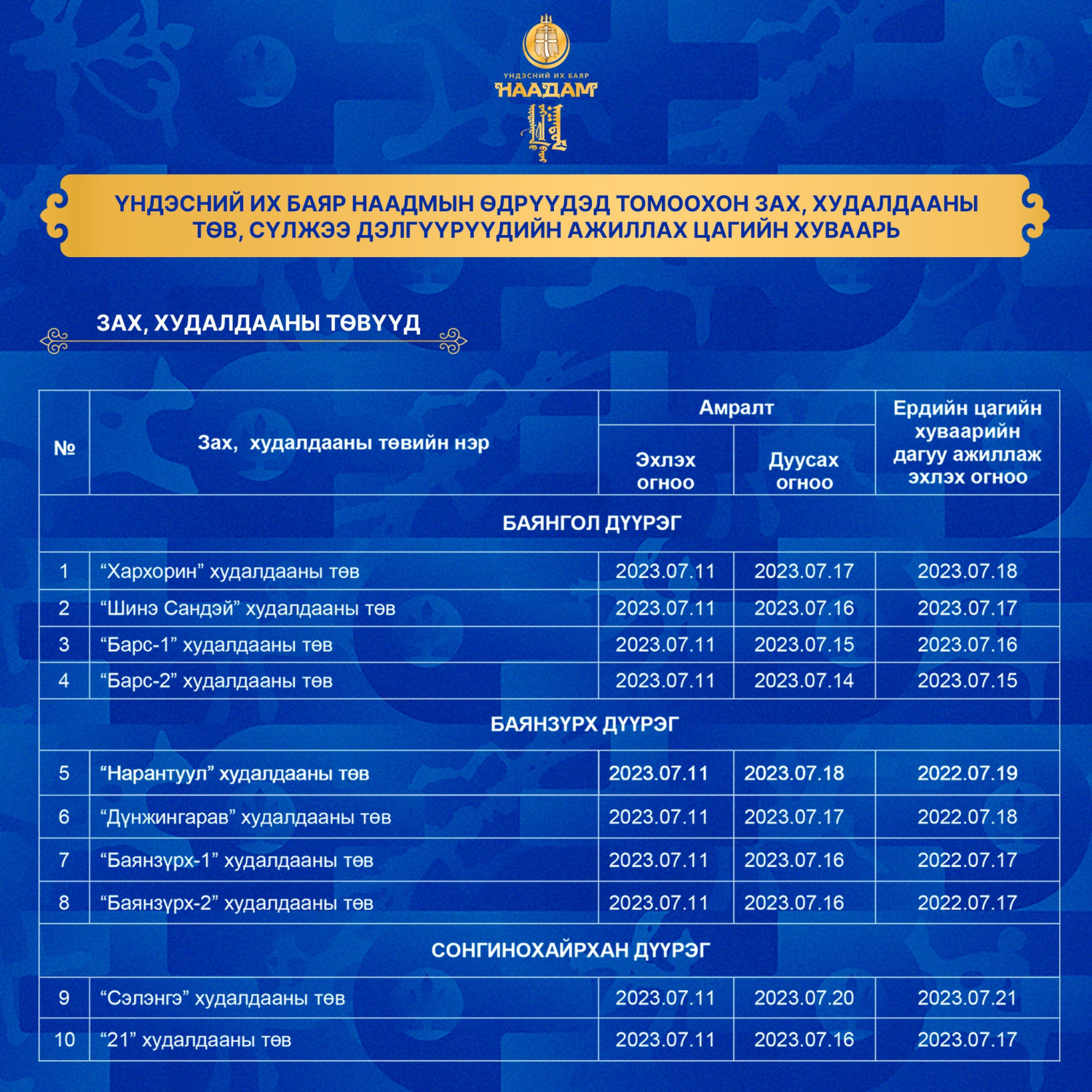 Үндэсний их баяр наадмаар хуульд заасны дагуу долдугаар сарын 10-17-ны өдөр бүх нийтийн амралт тохиож байгаа. Үүнтэй холбоотойгоор баяр наадмын өдрүүдэд худалдаа үйлчилгээний байгууллагуудын ажиллах цагийн хуваарийг хүргэж байна.