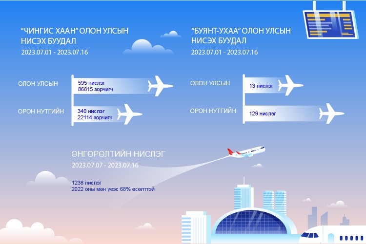 Мөн баяр наадмын амралтын өдрүүд буюу долоодугаар сарын 07-16-ны өдрүүдэд өнгөрөлтийн нислэгийн тоо 1238 нислэг болж, өнгөрөгч оны мөн үетэй харьцуулахад 501 нислэгээр илүү буюу 68 хувиар өссөн үзүүлэлттэй байна