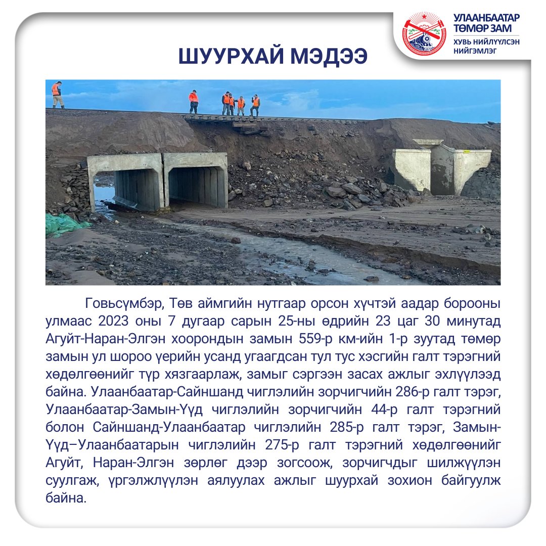 Говьсүмбэр, Төв аймгийн нутгаар орсон хүчтэй аадар борооны улмаас 2023 оны долдугаар сарын 25-ны өдрийн 23:30 цагт Агуйт-Наран-Элгэн хоорондын замын 559-р км-ийн нэгдүгээр зуутад төмөр замын ул шороо үерийн усанд угаагдсан тул тус хэсгийн галт тэрэгний хөдөлгөөнийг түр хязгаарлаж, замыг сэргээн засах ажлыг эхлүүлээд байна.