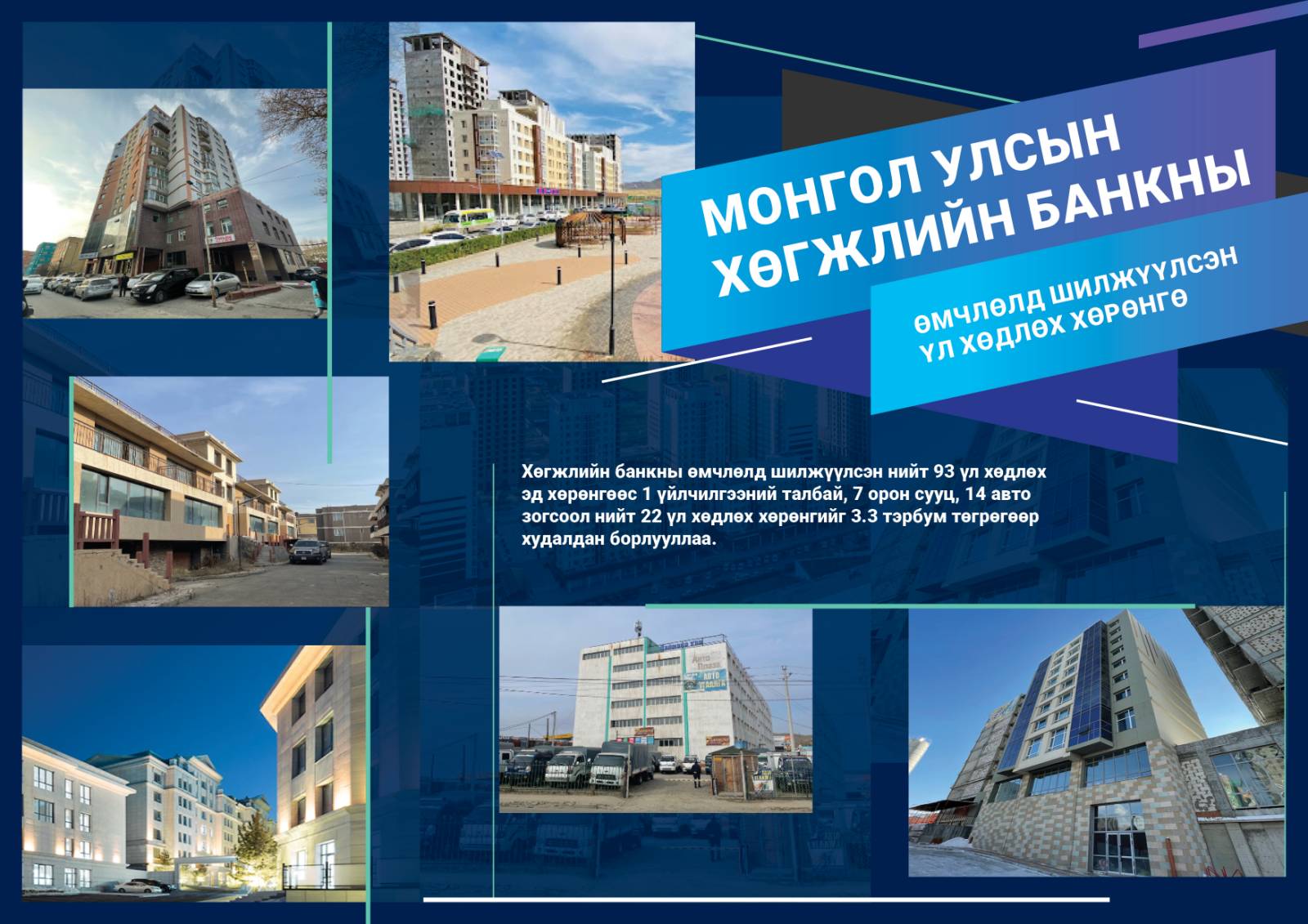 Хөгжлийн банкны өмчлөлд шилжүүлсэн нийт 93 үл хөдлөх эд хөрөнгөөс нэг үйлчилгээний талбай, долоо орон сууц, 14 авто зогсоол нийт 22 үл хөдлөх хөрөнгийг 3.3 тэрбум төгрөгөөр худалдан борлууллаа. Монгол Улсын Хөгжлийн банк зээлийн эргэн төлөлтийг бэлэн мөнгөөр, өмчлөх бусад үл хөдлөх хөрөнгөөр, үнэт цаасаар барагдуулах хүрээнд зарим зээлээ шүүхийн шийдвэрийн дагуу барьцаа хөрөнгөөр хангуулж, банкны өмчлөлд шилжүүлэн төлж барагдуулахаар ажиллаж байгаа билээ. Үүний хүрээнд Хөгжлийн банкны өмчлөл, эзэмшилд шилжүүлсэн үл хөдлөх хөрөнгүүдийг Монгол Улсын Хөгжлийн банкны www.dbm.mn цахим хуудсаар дамжуулан олон нийтэд нээлттэй, ил тод, шилэн байдлаар худалдан борлуулах үйл ажиллагаа үргэлжилж байна.