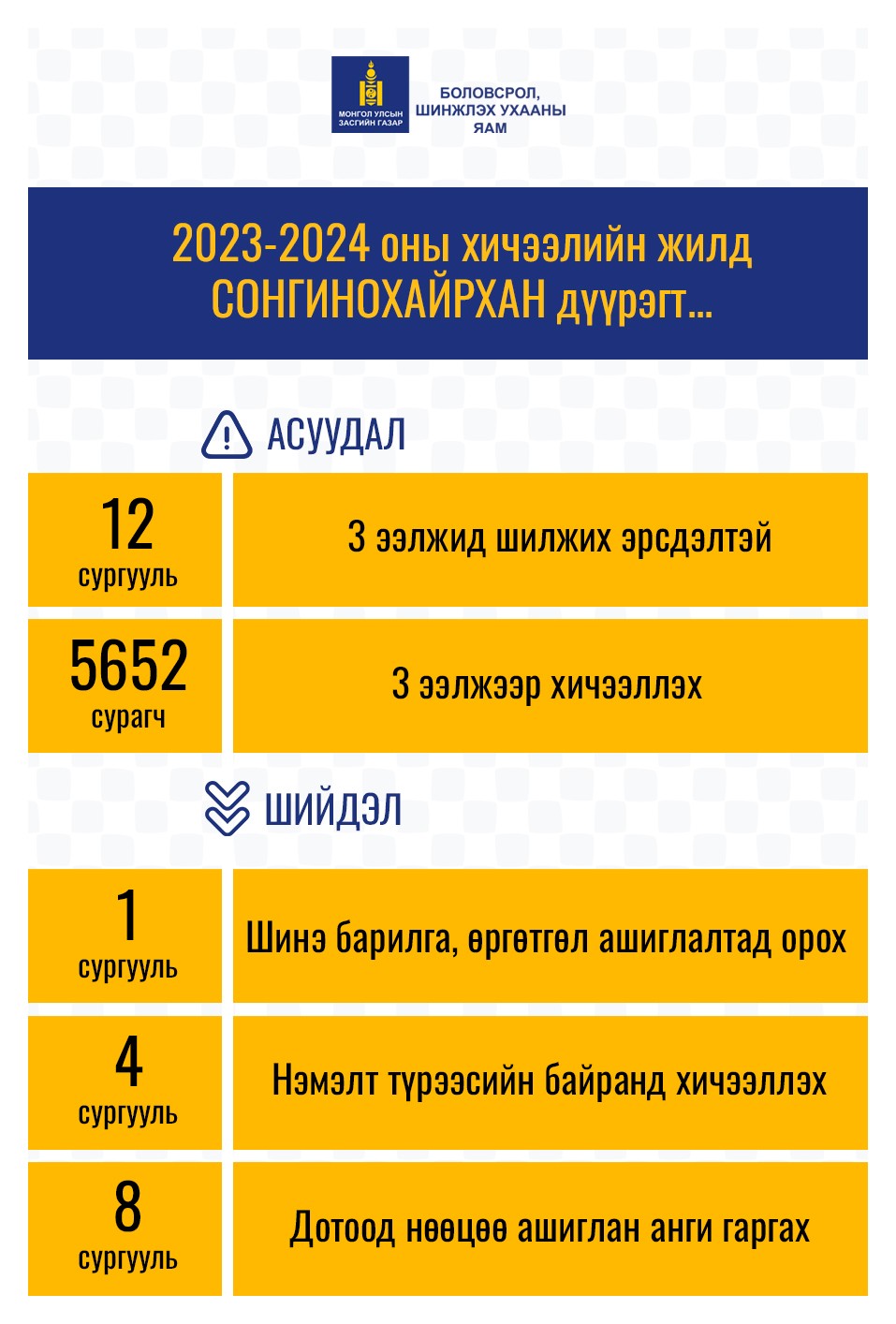 2023-2024 оны хичээлийн жилд гурван ээлжид шилжих эрсдэлтэй 47 сургууль нийслэлд байна. Түүний 12 сургууль нь Сонгинохайрхан дүүргийн нутаг дэвсгэрт байрлаж байна. Өчигдөр Улсын Их Хурал, Засгийн газрын гишүүд болон холбогдох яам агентлаг, нийслэлийн удирдлагууд тус дүүрэгт ажиллаж хүндрээд байгаа сургуулиудын асуудлыг газар дээр нь шийдвэрлэж ажиллав.