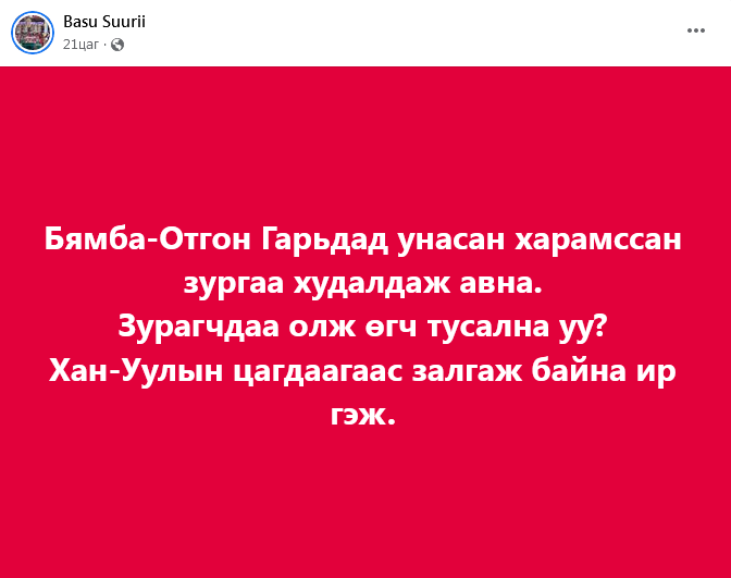Тэрбээр цахим хаягтаа "Улсын гарди Ц.Бямба-Отгонтой барилдаж, унахдаа харамссан зургаа худалдаж авна. Хан-Уул дүүргийн цагдаагаас залгаж байна. Унасан хүн харамсаж болохгүй болж байгаа юм шиг байна" гэж бичжээ.