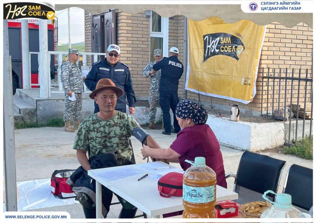 | Сэлэнгэ аймгийн цагдаа нар орон нутгийн замд яваа жолооч нарт кофе өгч, даралтыг нь үзэж байна |