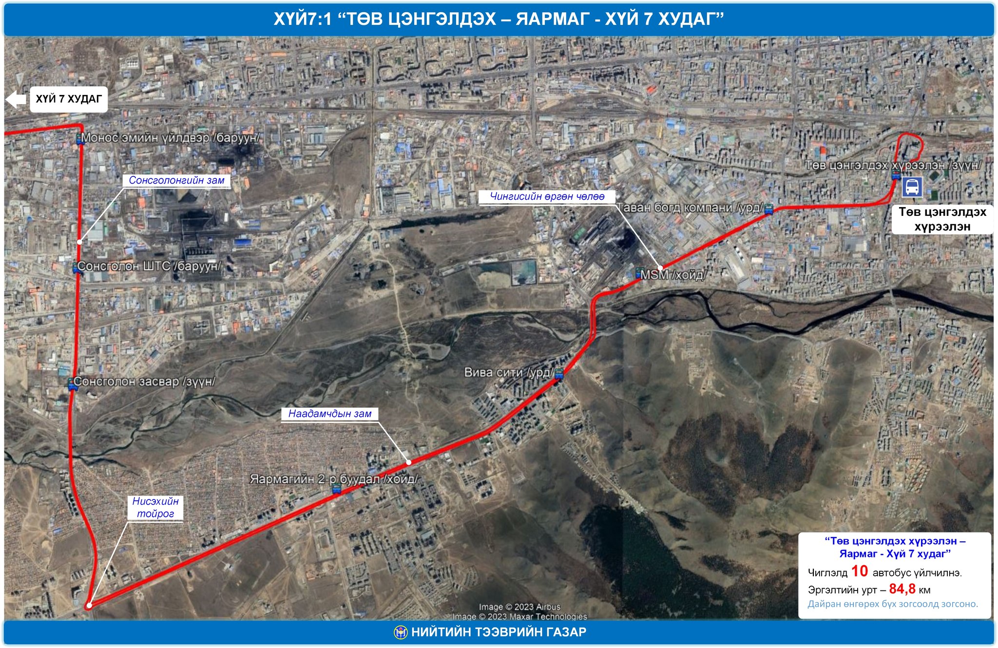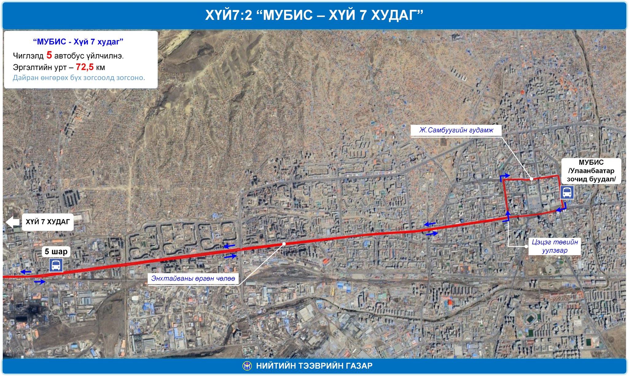 06-нд 08:00-22:00 цагийн хооронд “МУБИС-Хүй долоон худаг”, “Төв цэнгэлдэх-Хүй долоон худаг” гэсэн чиглэлд нийтийн тээвэр иргэдэд үйлчилнэ.