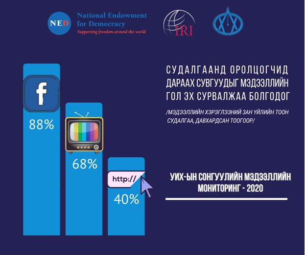 Улс төрийн холбогдол бүхий төрөл бүрийн мэдээлэл хэрхэн, ямар утга агуулга, суваг, хэлбэр, арга тактикаар тархаж, иргэд хэрхэн хүлээж авч, оролцож байгааг тандахад, сонгуулийн албан ёсны сурталчилгаагаар Фэйсбүүкээр түгээсэн, сонгуультай холбоотой мэдээллийн 80 гаруй хувь нь ил, далд ухуулга, сурталчилгаа болон өрөөсгөл, дэгсдүүлсэн, бүрэн бус, гуйвуулсан мэдээлэл байв.