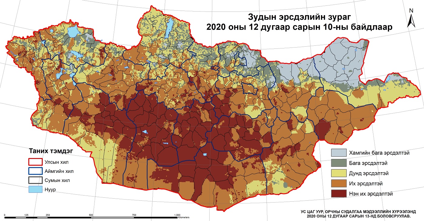 Ус цаг уур, орчны судалгаа мэдээллийн хүрээлэнгээс ган зуншлага, цас зуд, бэлчээртэй холбоотой газрын ажиглалтын болон хиймэл дагуулын олон төрлийн мэдээг нэгтгэн боловсруулж, зудын эрсдэлийн зураг мэдээг гаргалаа.