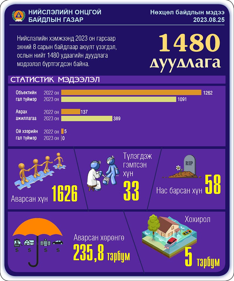 Нийслэлийн хэмжээнд 2023 он гарсаар эхний наймдугаар сарын байдлаар аюулт үзэгдэл, ослын нийт 1480 удаагийн дуудлага мэдээлэл бүртгэгдсэн байна. Үүнээс гал түймрийн 1091, эрэн хайх, аврах ажиллагааны 389 удаагийн дуудлагаар алба хаагчид үүрэг гүйцэтгэн, 1626 иргэний аюулгүй байдлыг хангаж, 235,8 тэрбум төгрөгийн өмч хөрөнгийг авран хамгаалж ажиллалаа.