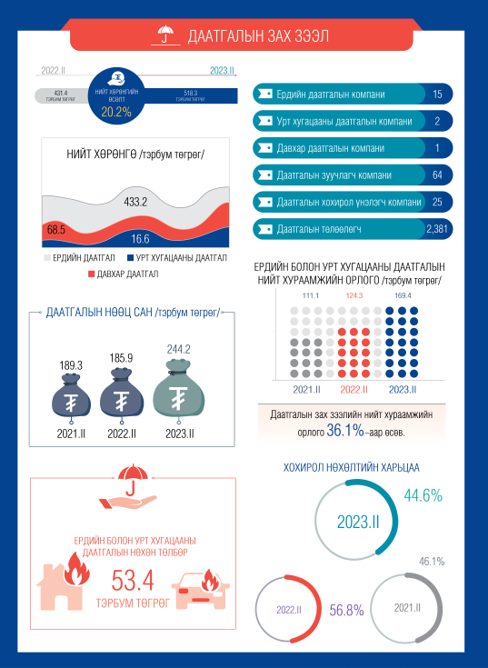 Харин давхар даатгалын компаниудын нийт хөрөнгө өмнөх оны мөн үетэй харьцуулахад 10.5 хувиар өсөж, 68.5 тэрбум төгрөгт хүрсэн нь салбарын нийт хөрөнгийн 13.2 хувийг эзэлжээ. Урт хугацааны даатгалын компанийн нийт хөрөнгийн хэмжээ өмнөх оны мөн үетэй харьцуулахад 64.5 хувиар өсөж, 16.6 тэрбум төгрөгт хүрч, салбарын 3.2 хувийг эзэлж байна.