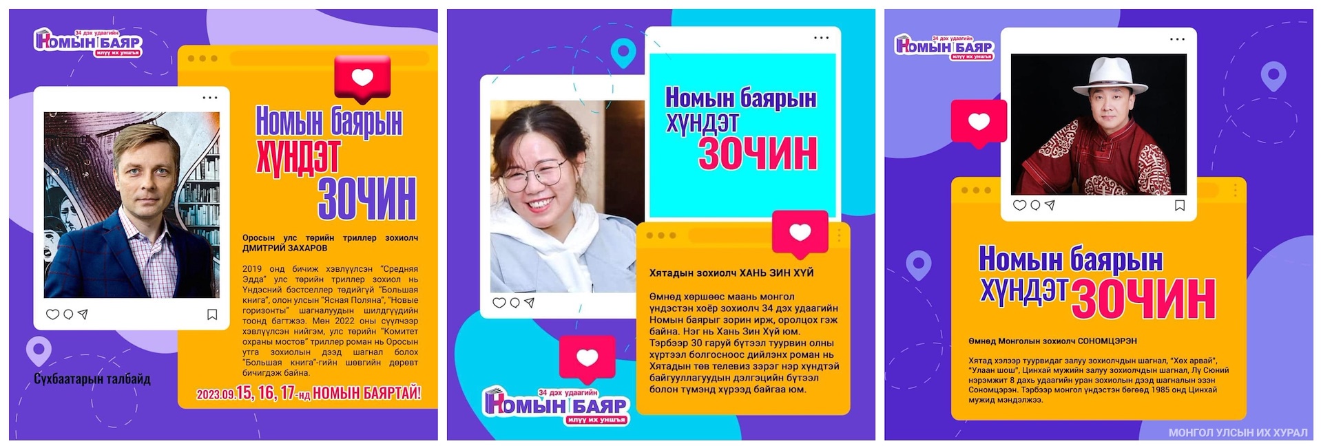 Намрын номын баярт ОХУ-ын төрийн шагналт Павел Басинский, оросын улс төрийн триллер зохиолч Дмитрий Захаров, зохиолч сурган хүмүүжүүлэгч Екатерина Барбаняга, түүхч, соёл судлаач Анна Эспарса, Анастасия Игоревна Строкина, Игорь Сид, Буриадын зохиолч Ширеторов Чингис Пурбоевич, Халимагийн түүхч Басан Захаров, БНХАУ-ын зохиолч Хань Зин Хүй, БНХАУ-ын ӨМӨЗО-ны зохиолч Сономцэрэн, Италийн утга зохиолын Грицане Кавур шагналт, Хятадын мета-зөгнөлт буюу постмодернист зохиолын аварга гэгддэг Үй Хуа нар шинэ номын нээлтээ хийж, уншигчидтай уулзан, тусгай лекцүүдээ унших юм байна.