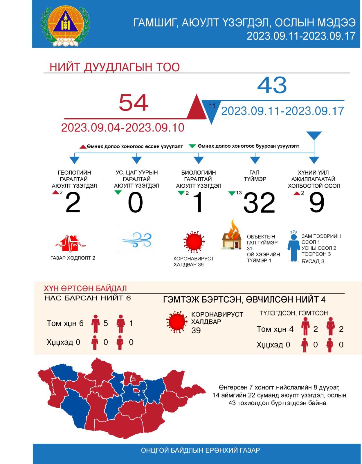 Улсын хэмжээнд өнгөрсөн долоо хоногт буюу есдүгээр сарын 11-нээс 17-ны өдрүүдэд нийслэлийн найман дүүрэг, 14 аймгийн 22 суманд 43 удаагийн аюулт үзэгдэл, ослын дуудлага бүртгэгдлээ. Үүнээс хүний үйл ажиллагаатай осол ес, гал түймрийн тохиолдол 32, биологийн гаралтай аюулт үзэгдэл нэг, геологийн гаралтай аюулт үзэгдэл хоёр бүртгэгдсэн байна.