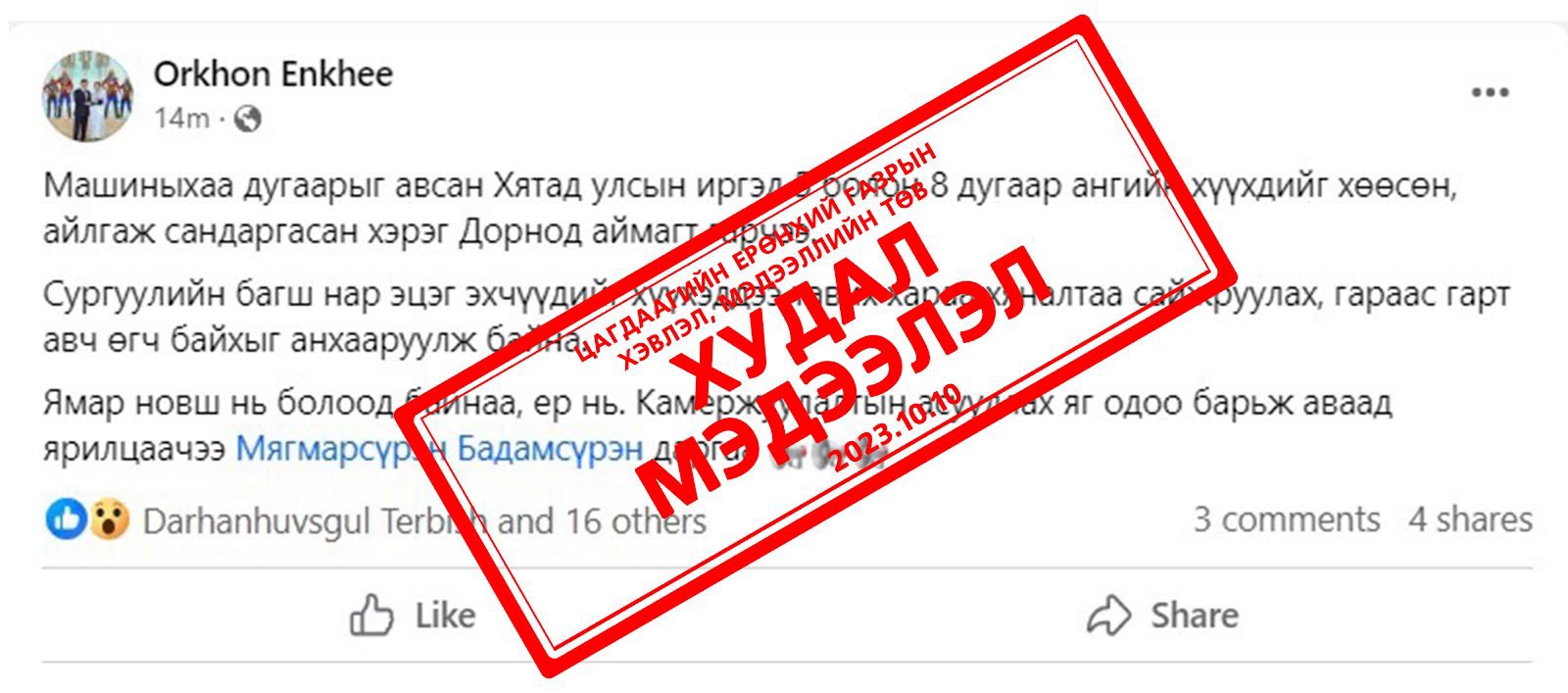 Тус аймгийн дунд сургуулийн нэгэн багш эцэг, эхчүүддээ сэрэмжлүүлэг өгөхдөө болоогүй зүйлийг болсон мэтээр ярьсныг зарим иргэд итгэж нийтэлжээ. Иймд олон нийтийн цахим сүлжээнд үнэн, худал нь тодорхойгүй, эх сурвалжгүй мэдээллийг түгээж, иргэдийг төөрөгдөлд оруулахгүй байх, аливаа мэдээллийн үнэн эсэхийг нягталж байхыг цагдаагийн байгууллагаас зөвлөж байна