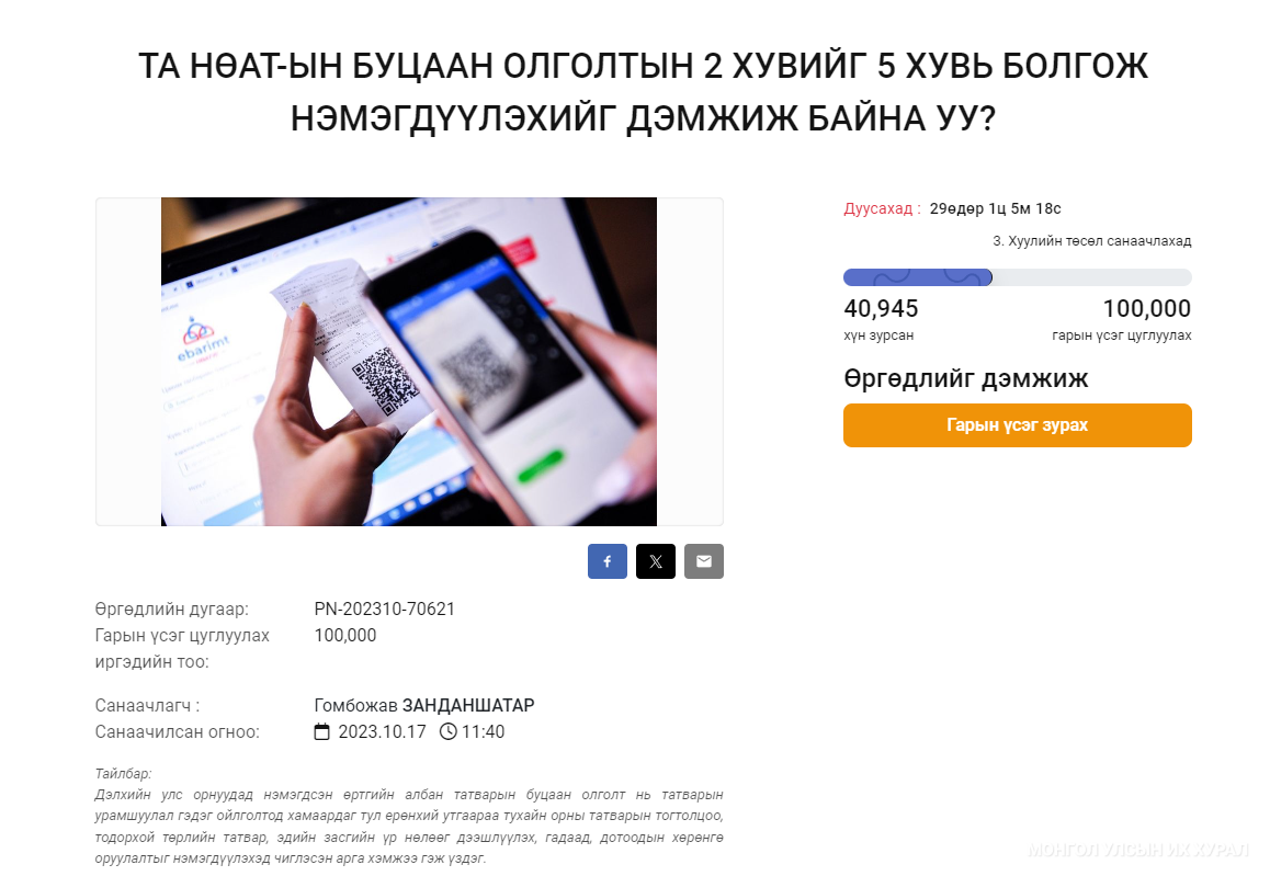 Дээрх саналыг petition.parliament.mn цахим системд байршуулснаас хойш 24 цаг өнгөрөхөд нийт 40 гаруй мянган иргэн дэмжээд байна.